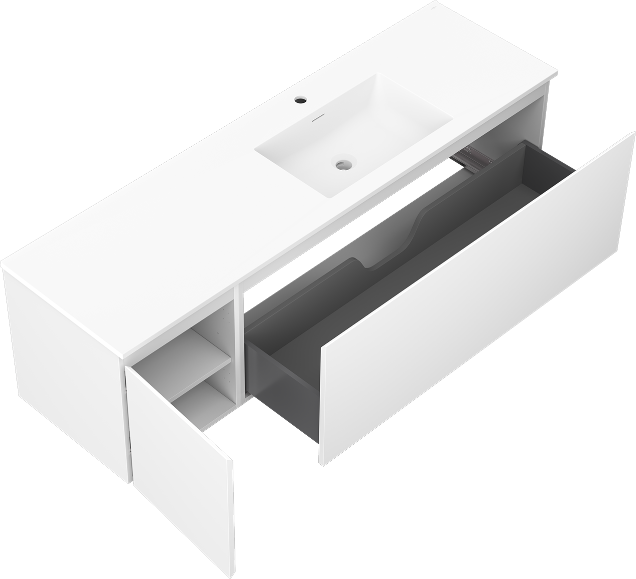 A fiókban lévő kivágás úgy van kialakítva, hogy befogadja a mosdó telepítéseknél szükséges szifont. Ennek köszönhetően a bútor teljesen funkcionálisan felszerelhető anélkül, hogy a fiók terének egy részét fel kellene áldozni a telepítés miatt.