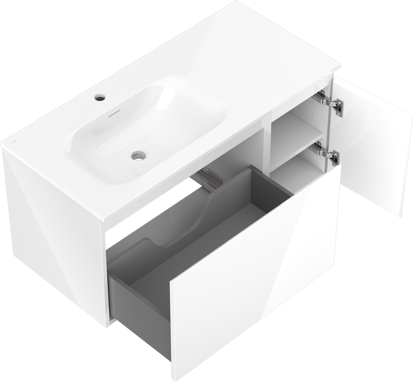 A fiókban lévő kivágás úgy van kialakítva, hogy befogadja a mosdó telepítéseknél szükséges szifont. Ennek köszönhetően a bútor teljesen funkcionálisan felszerelhető anélkül, hogy a fiók terének egy részét fel kellene áldozni a telepítés miatt.
