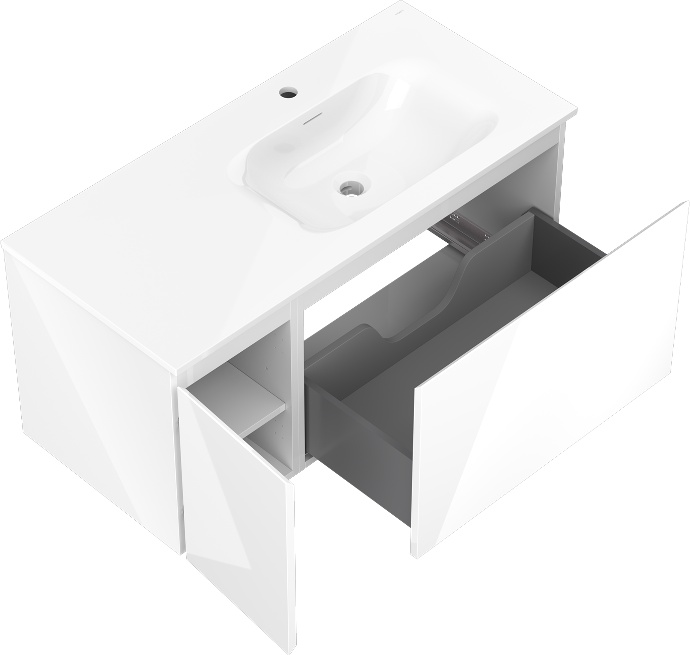 A fiókban lévő kivágás úgy van kialakítva, hogy befogadja a mosdó telepítéseknél szükséges szifont. Ennek köszönhetően a bútor teljesen funkcionálisan felszerelhető anélkül, hogy a fiók terének egy részét fel kellene áldozni a telepítés miatt.