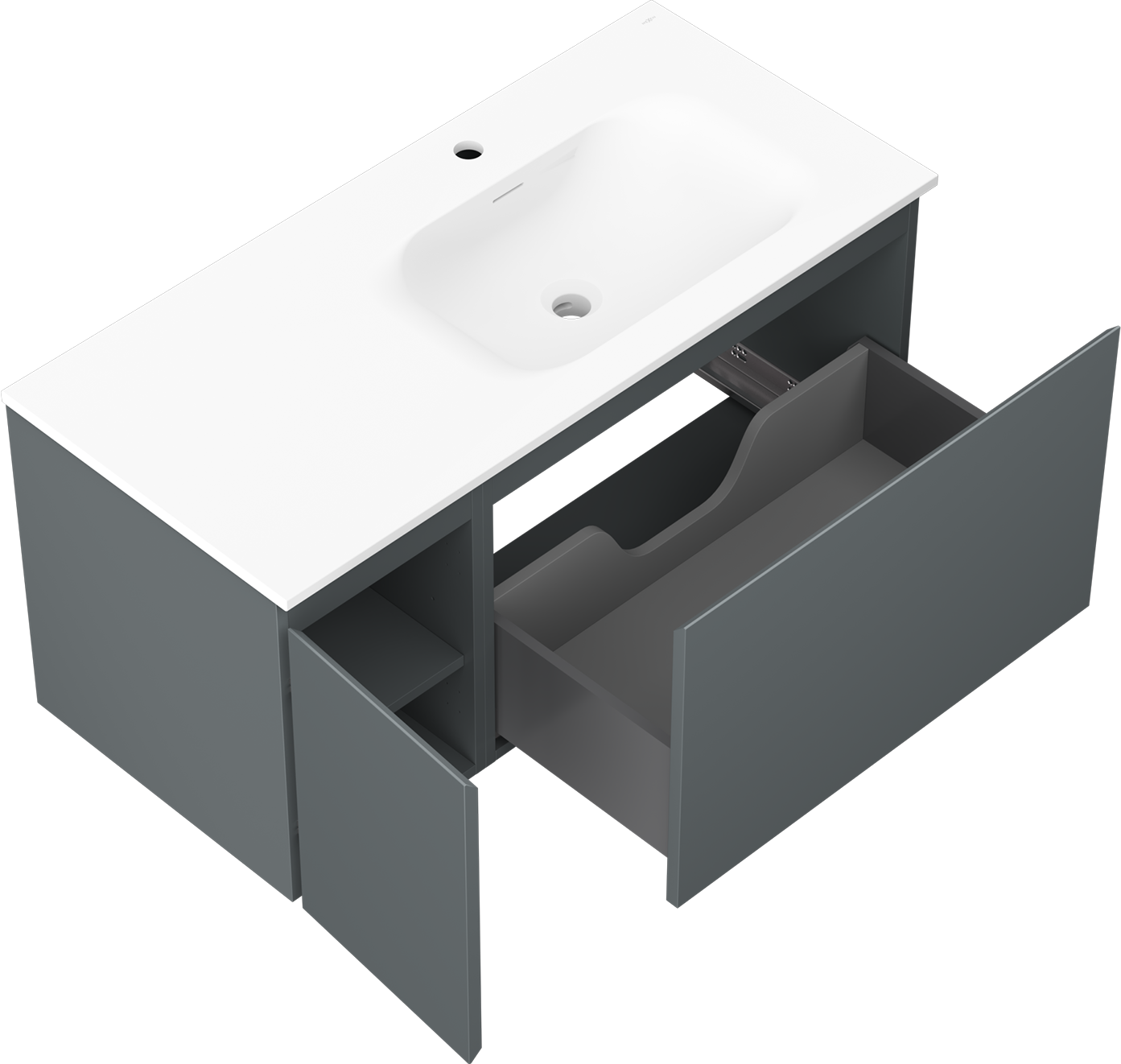 A fiókban lévő kivágás úgy van kialakítva, hogy befogadja a mosdó telepítéseknél szükséges szifont. Ennek köszönhetően a bútor teljesen funkcionálisan felszerelhető anélkül, hogy a fiók terének egy részét fel kellene áldozni a telepítés miatt.