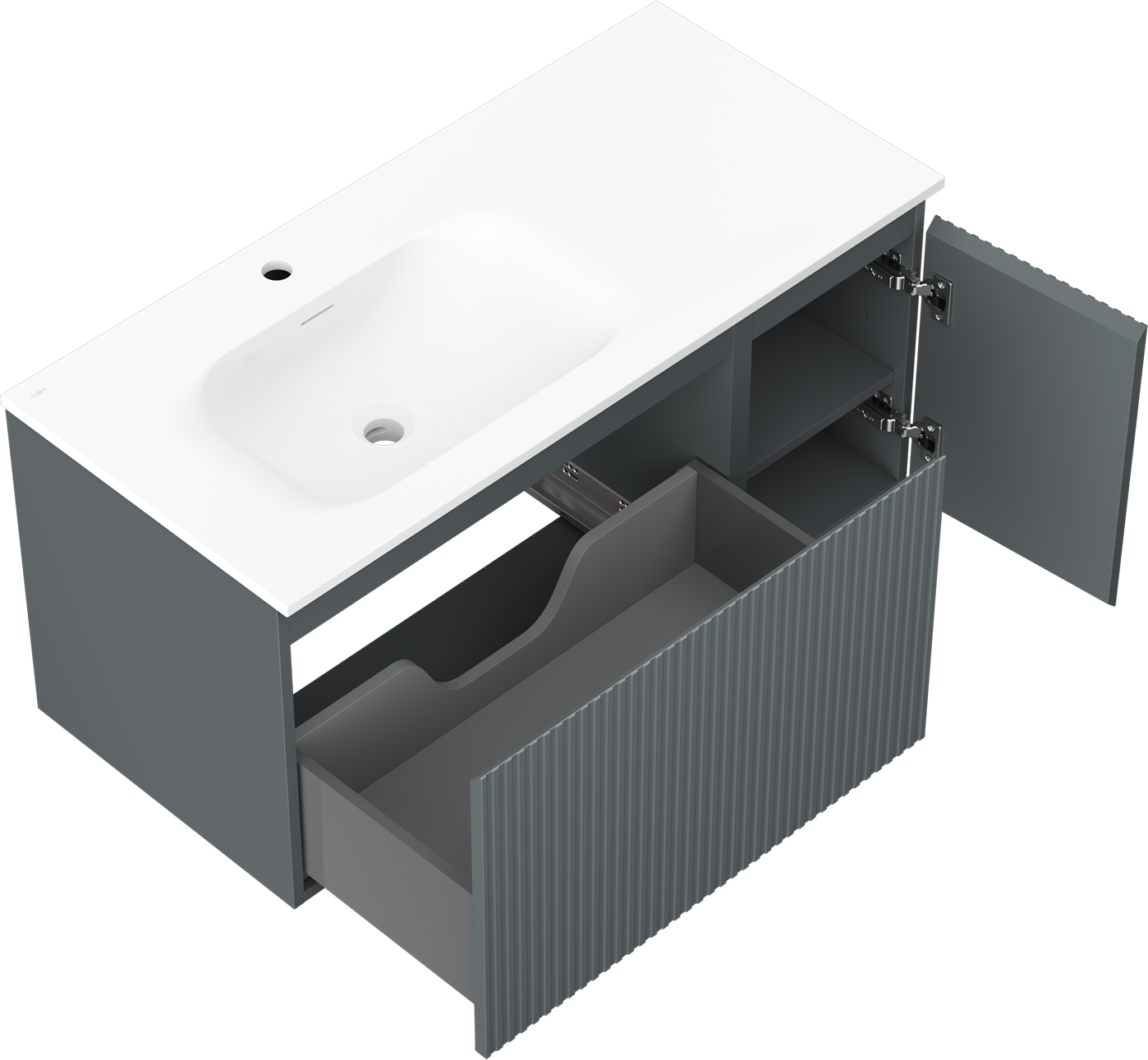 A fiókban lévő kivágás úgy van kialakítva, hogy befogadja a mosdó telepítéseknél szükséges szifont. Ennek köszönhetően a bútor teljesen funkcionálisan felszerelhető anélkül, hogy a fiók terének egy részét fel kellene áldozni a telepítés miatt.