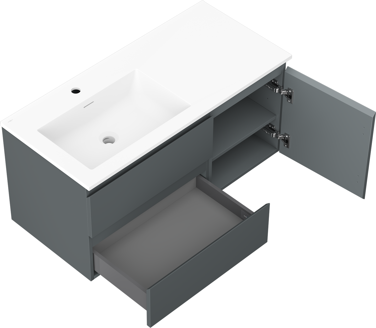 A fiókban lévő kivágás úgy van kialakítva, hogy befogadja a mosdó telepítéseknél szükséges szifont. Ennek köszönhetően a bútor teljesen funkcionálisan felszerelhető anélkül, hogy a fiók terének egy részét fel kellene áldozni a telepítés miatt.