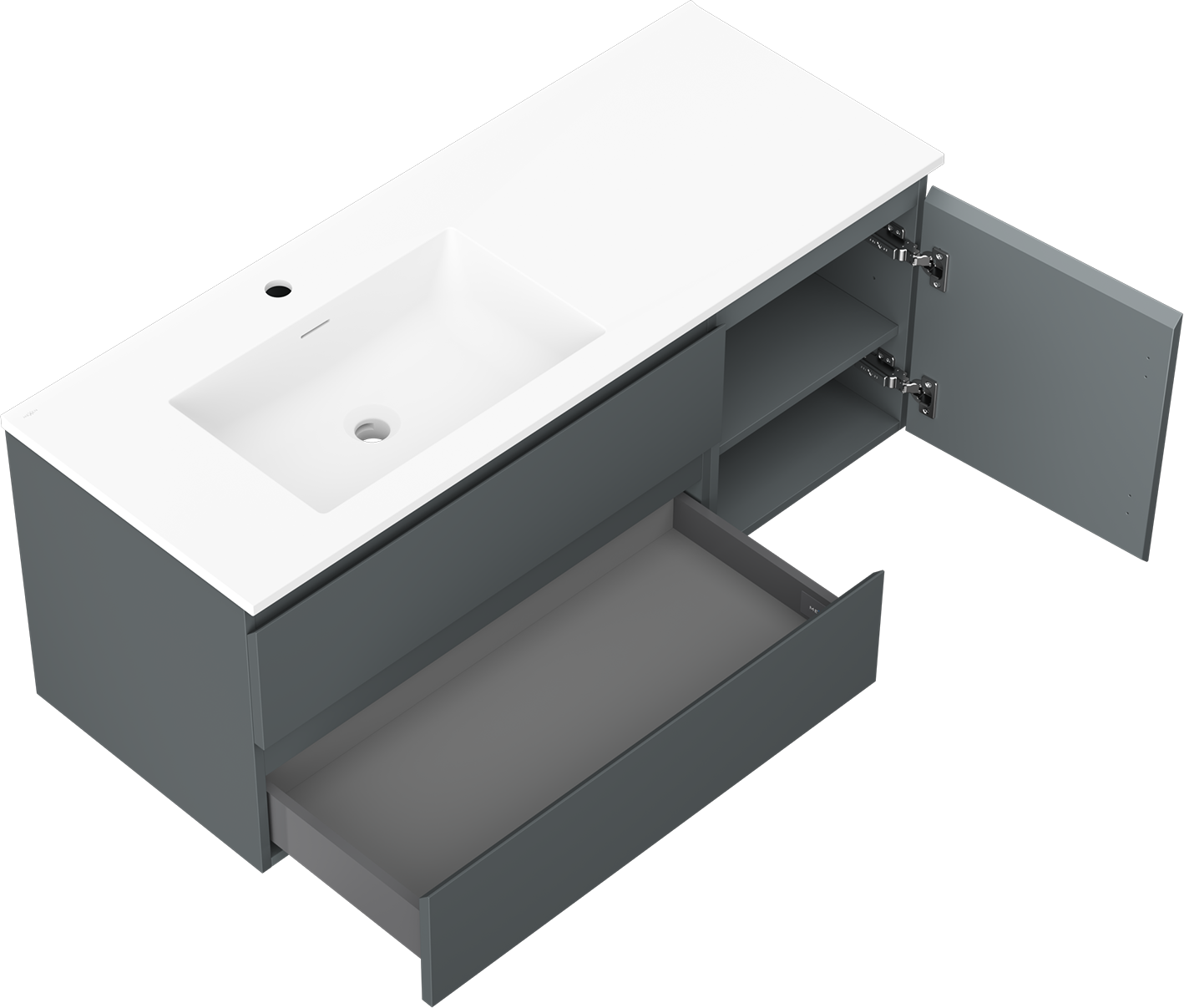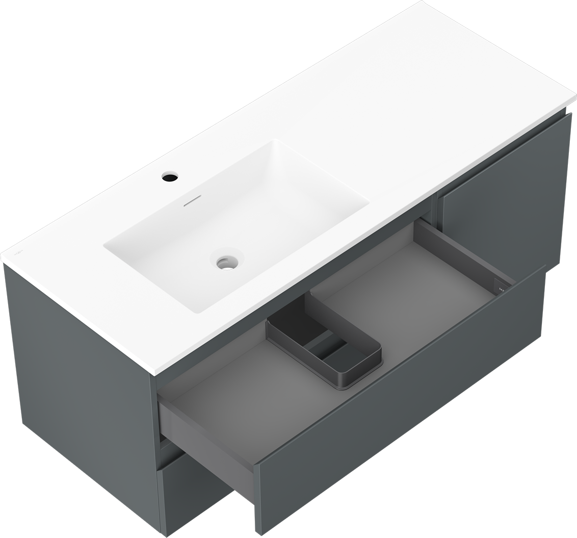 A fiókban lévő kivágás úgy van kialakítva, hogy befogadja a mosdó telepítéseknél szükséges szifont. Ennek köszönhetően a bútor teljesen funkcionálisan felszerelhető anélkül, hogy a fiók terének egy részét fel kellene áldozni a telepítés miatt.