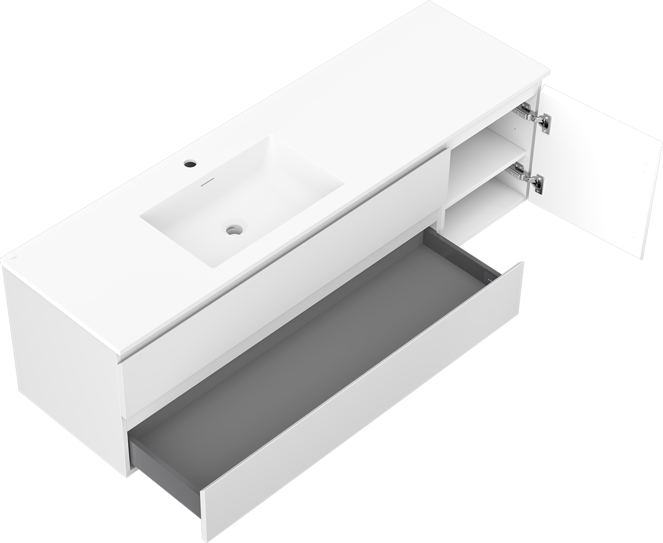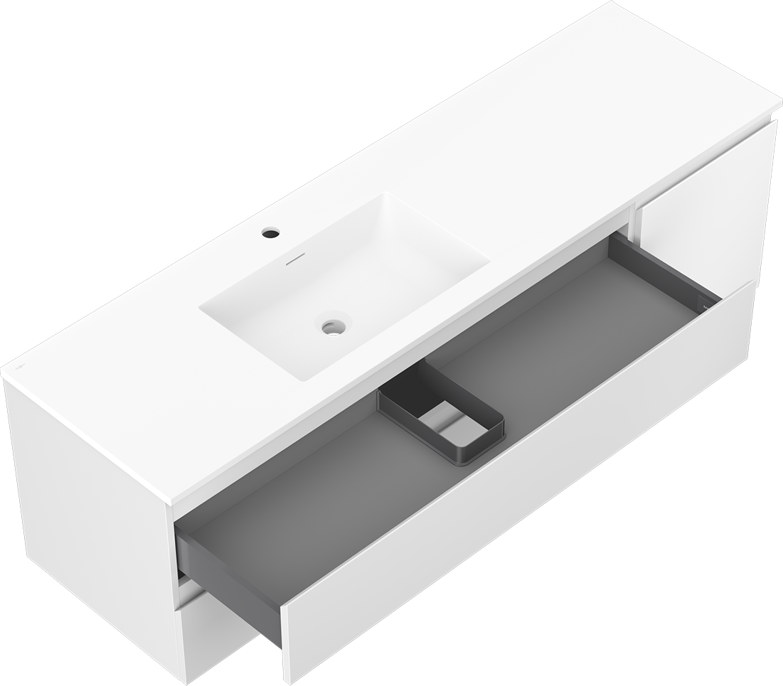 A fiókban lévő kivágás úgy van kialakítva, hogy befogadja a mosdó telepítéseknél szükséges szifont. Ennek köszönhetően a bútor teljesen funkcionálisan felszerelhető anélkül, hogy a fiók terének egy részét fel kellene áldozni a telepítés miatt.