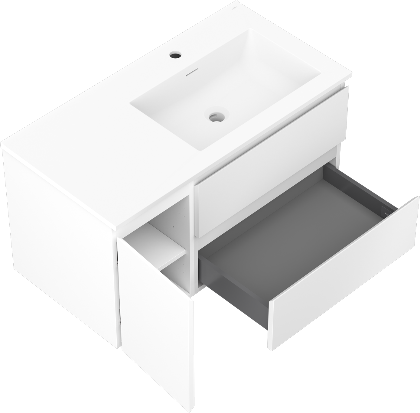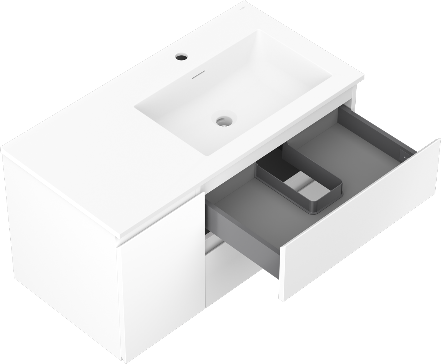 A fiókban lévő kivágás úgy van kialakítva, hogy befogadja a mosdó telepítéseknél szükséges szifont. Ennek köszönhetően a bútor teljesen funkcionálisan felszerelhető anélkül, hogy a fiók terének egy részét fel kellene áldozni a telepítés miatt.
