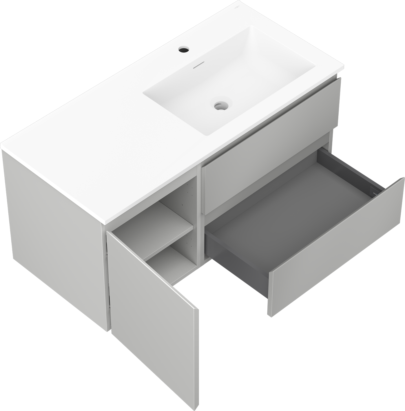 A fiókban lévő kivágás úgy van kialakítva, hogy befogadja a mosdó telepítéseknél szükséges szifont. Ennek köszönhetően a bútor teljesen funkcionálisan felszerelhető anélkül, hogy a fiók terének egy részét fel kellene áldozni a telepítés miatt.