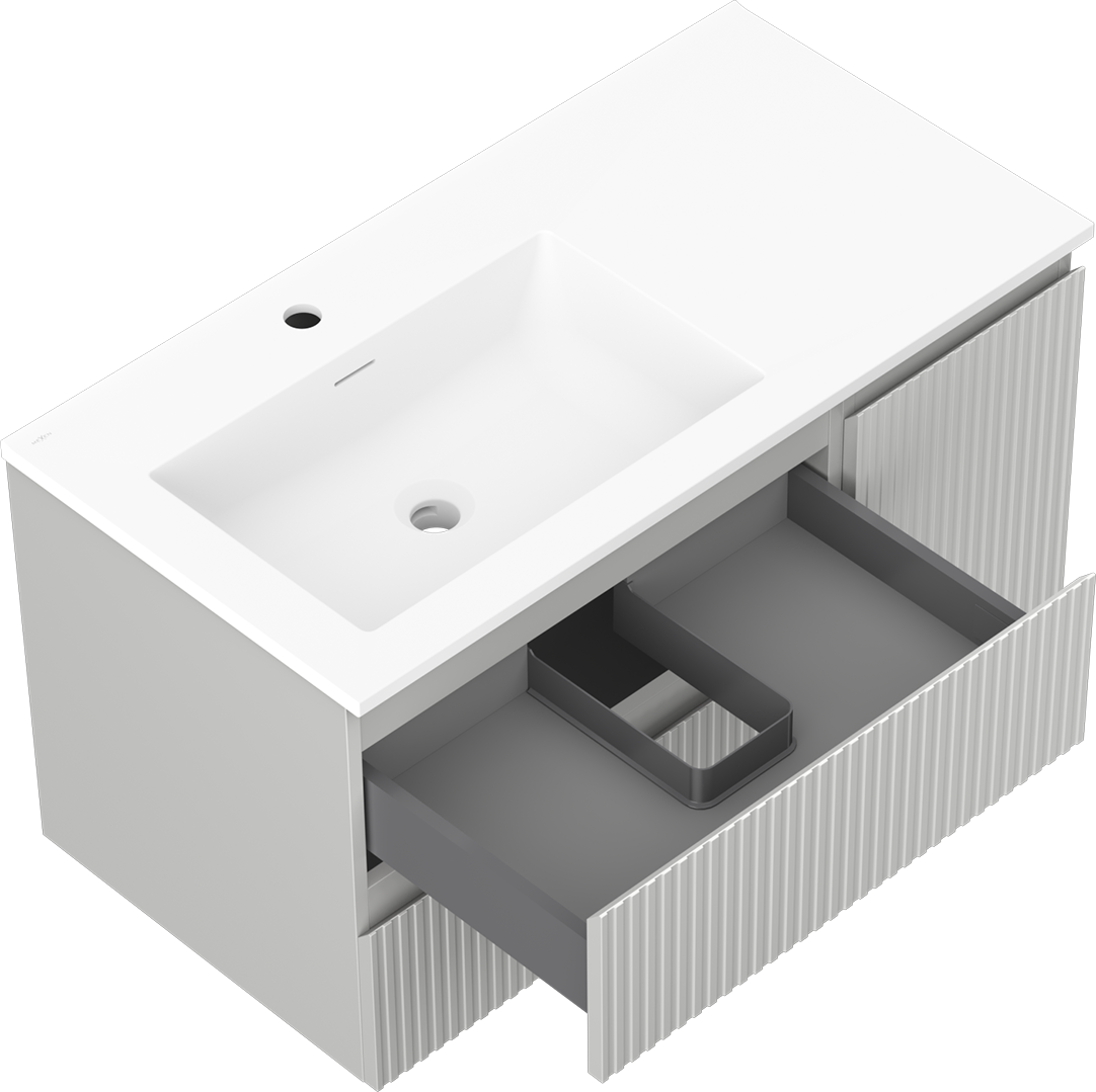 A fiókban lévő kivágás úgy van kialakítva, hogy befogadja a mosdó telepítéseknél szükséges szifont. Ennek köszönhetően a bútor teljesen funkcionálisan felszerelhető anélkül, hogy a fiók terének egy részét fel kellene áldozni a telepítés miatt.