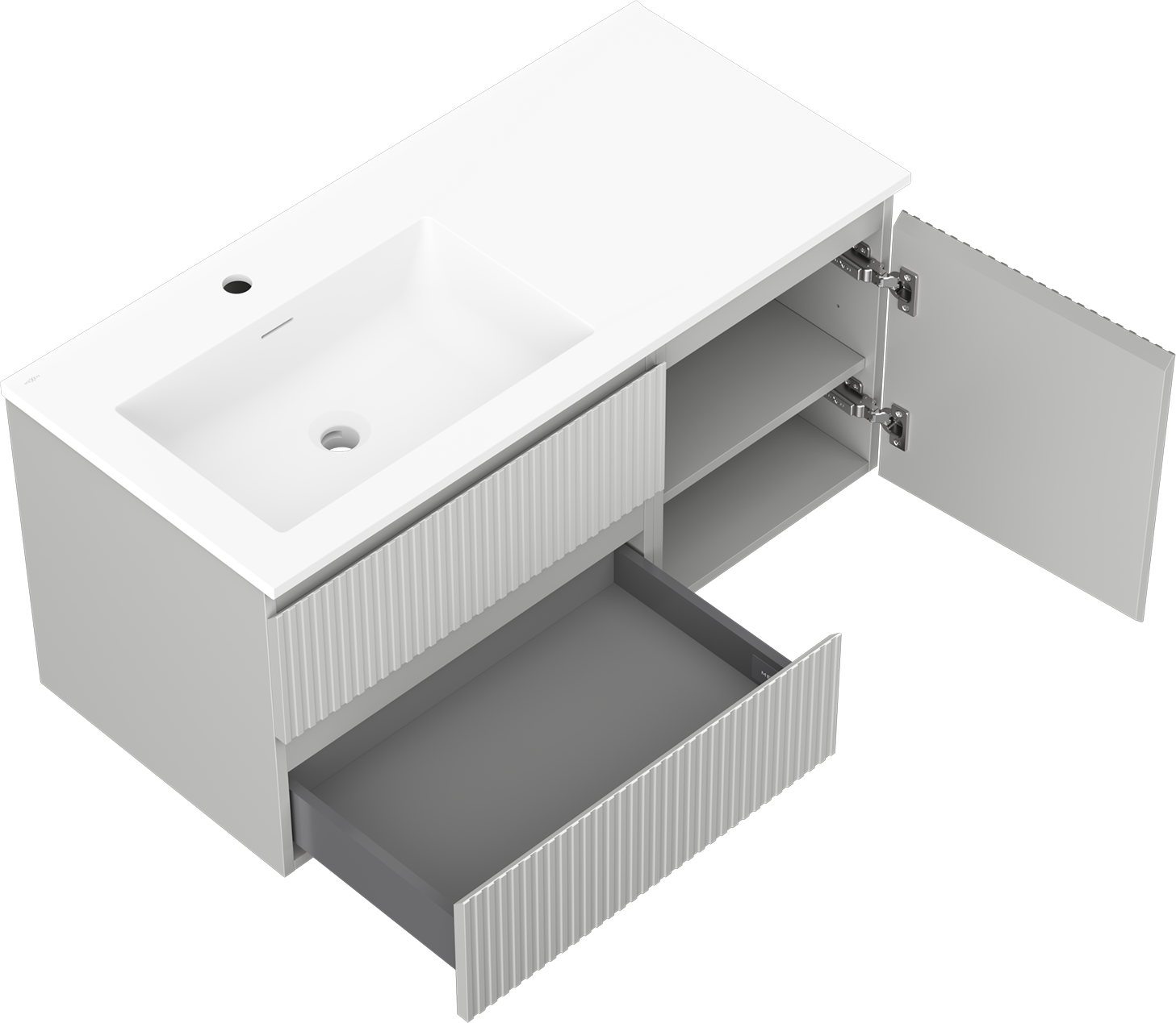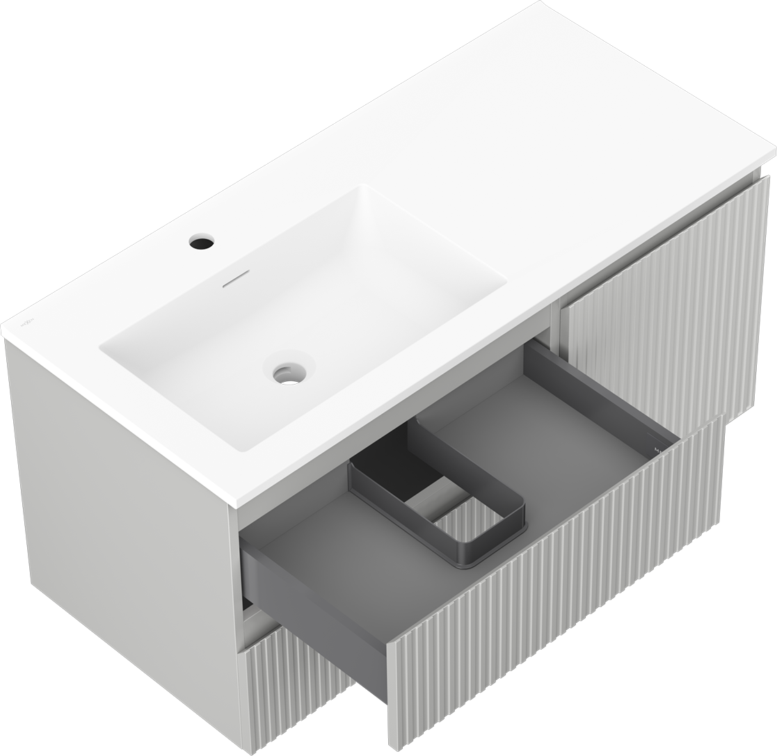 A fiókban lévő kivágás úgy van kialakítva, hogy befogadja a mosdó telepítéseknél szükséges szifont. Ennek köszönhetően a bútor teljesen funkcionálisan felszerelhető anélkül, hogy a fiók terének egy részét fel kellene áldozni a telepítés miatt.