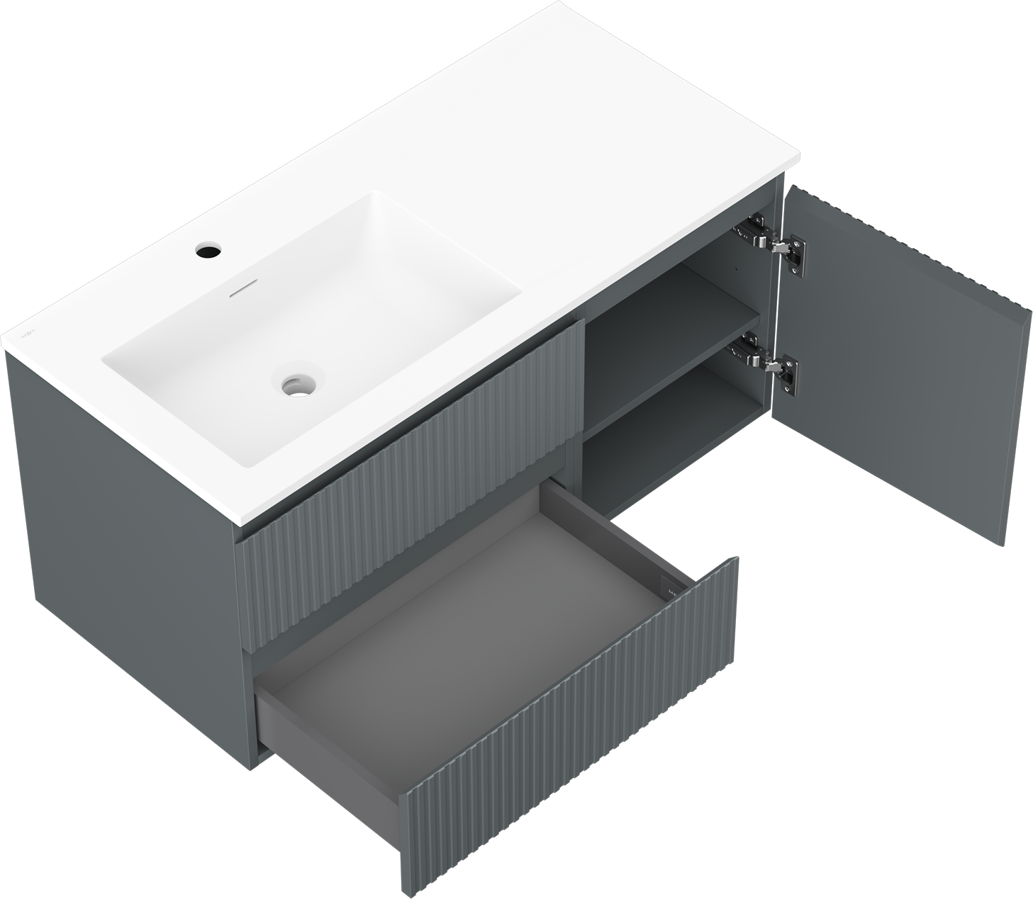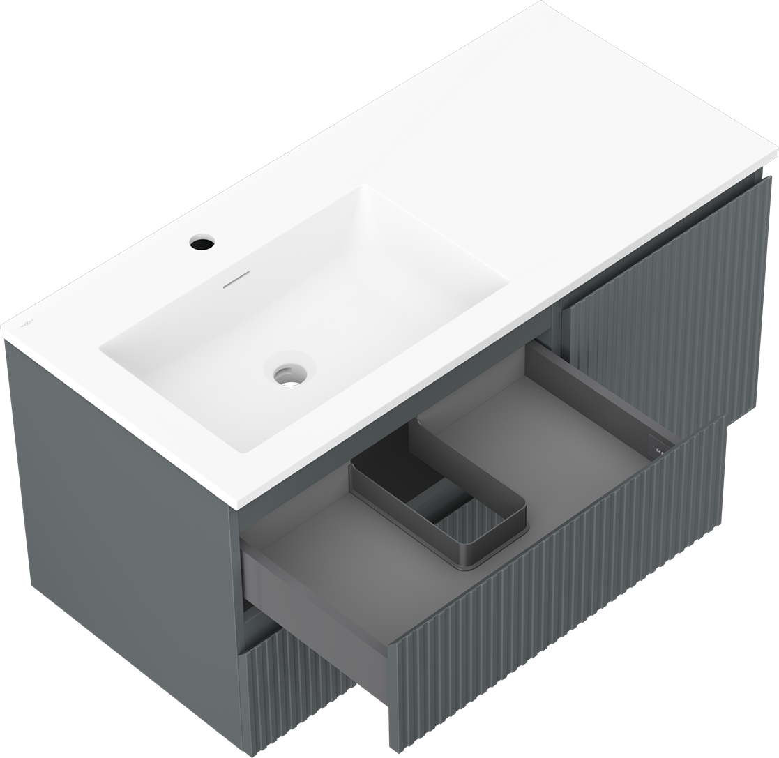 A fiókban lévő kivágás úgy van kialakítva, hogy befogadja a mosdó telepítéseknél szükséges szifont. Ennek köszönhetően a bútor teljesen funkcionálisan felszerelhető anélkül, hogy a fiók terének egy részét fel kellene áldozni a telepítés miatt.