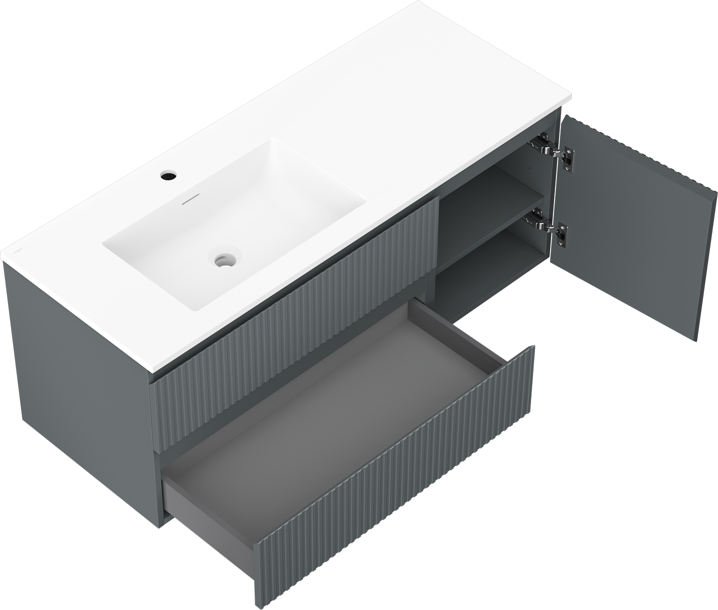 A fiókban lévő kivágás úgy van kialakítva, hogy befogadja a mosdó telepítéseknél szükséges szifont. Ennek köszönhetően a bútor teljesen funkcionálisan felszerelhető anélkül, hogy a fiók terének egy részét fel kellene áldozni a telepítés miatt.