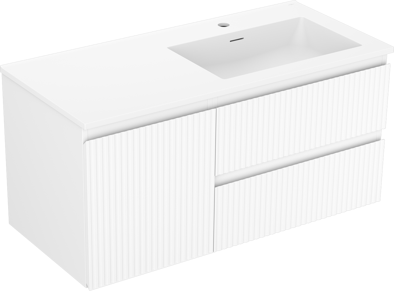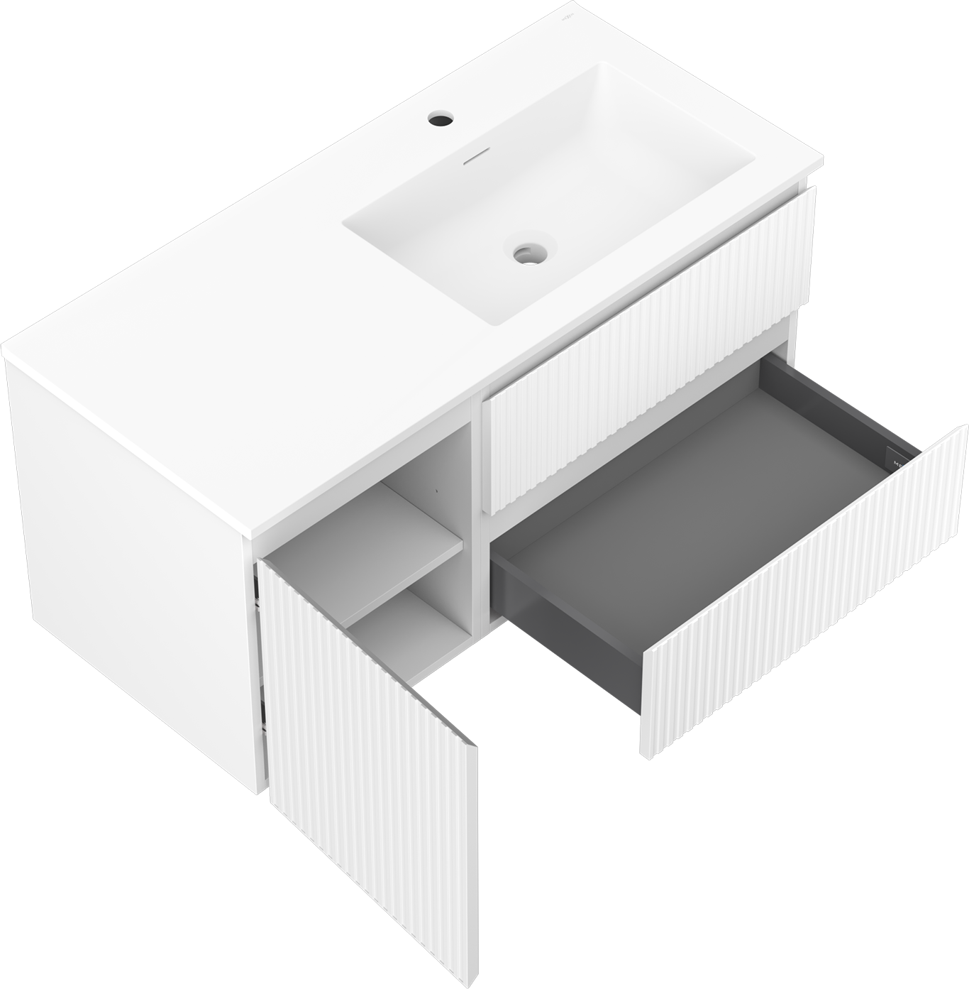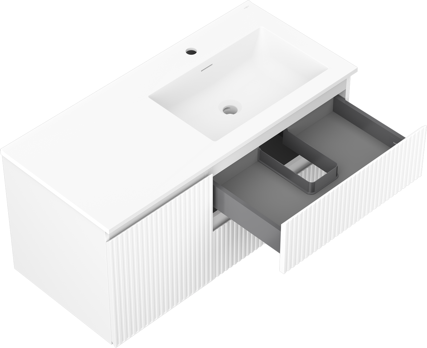 A fiókban lévő kivágás úgy van kialakítva, hogy befogadja a mosdó telepítéseknél szükséges szifont. Ennek köszönhetően a bútor teljesen funkcionálisan felszerelhető anélkül, hogy a fiók terének egy részét fel kellene áldozni a telepítés miatt.