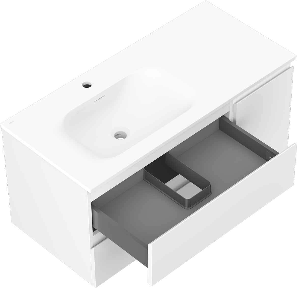 A fiókban lévő kivágás úgy van kialakítva, hogy befogadja a mosdó telepítéseknél szükséges szifont. Ennek köszönhetően a bútor teljesen funkcionálisan felszerelhető anélkül, hogy a fiók terének egy részét fel kellene áldozni a telepítés miatt.