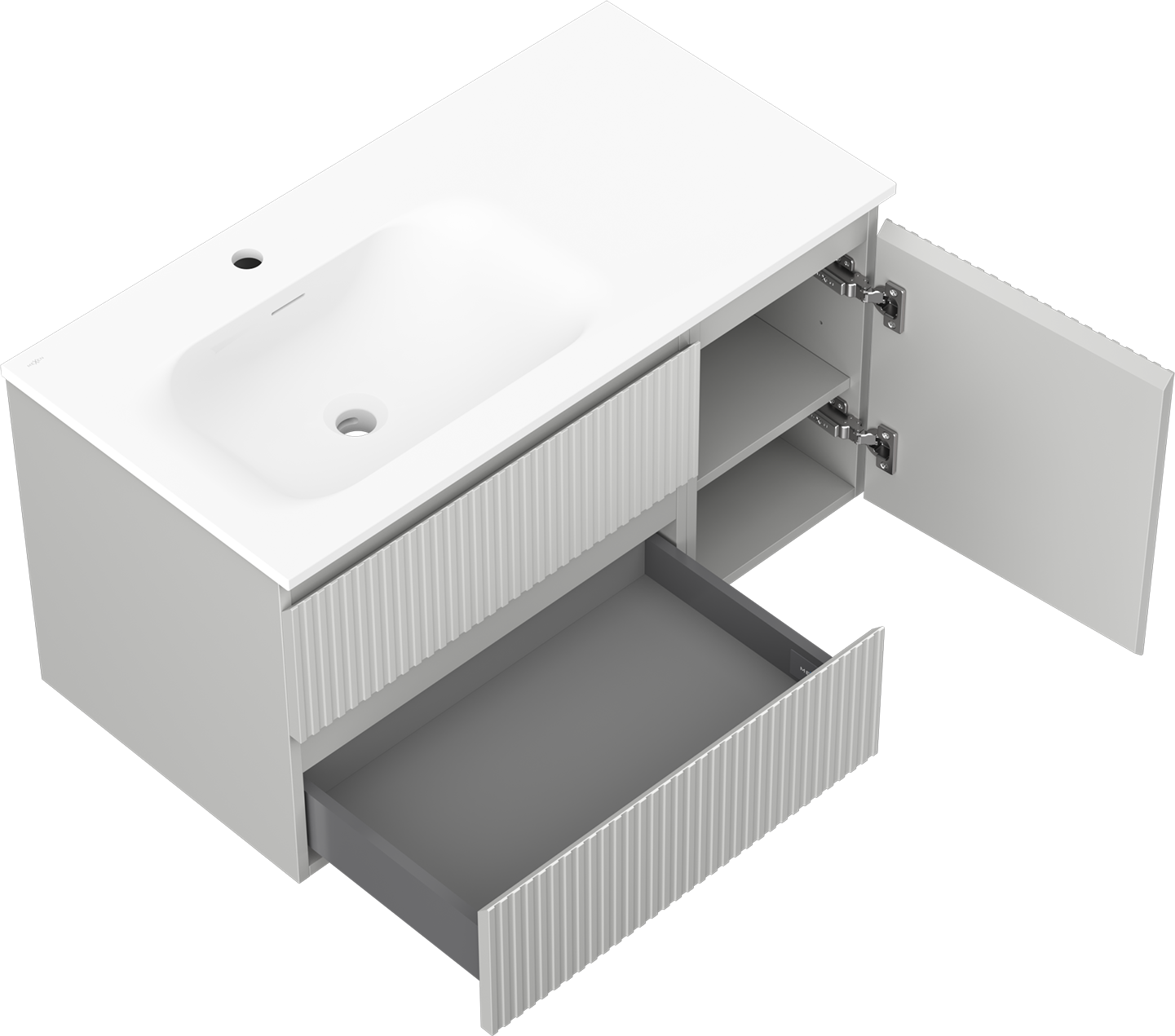 A fiókban lévő kivágás úgy van kialakítva, hogy befogadja a mosdó telepítéseknél szükséges szifont. Ennek köszönhetően a bútor teljesen funkcionálisan felszerelhető anélkül, hogy a fiók terének egy részét fel kellene áldozni a telepítés miatt.
