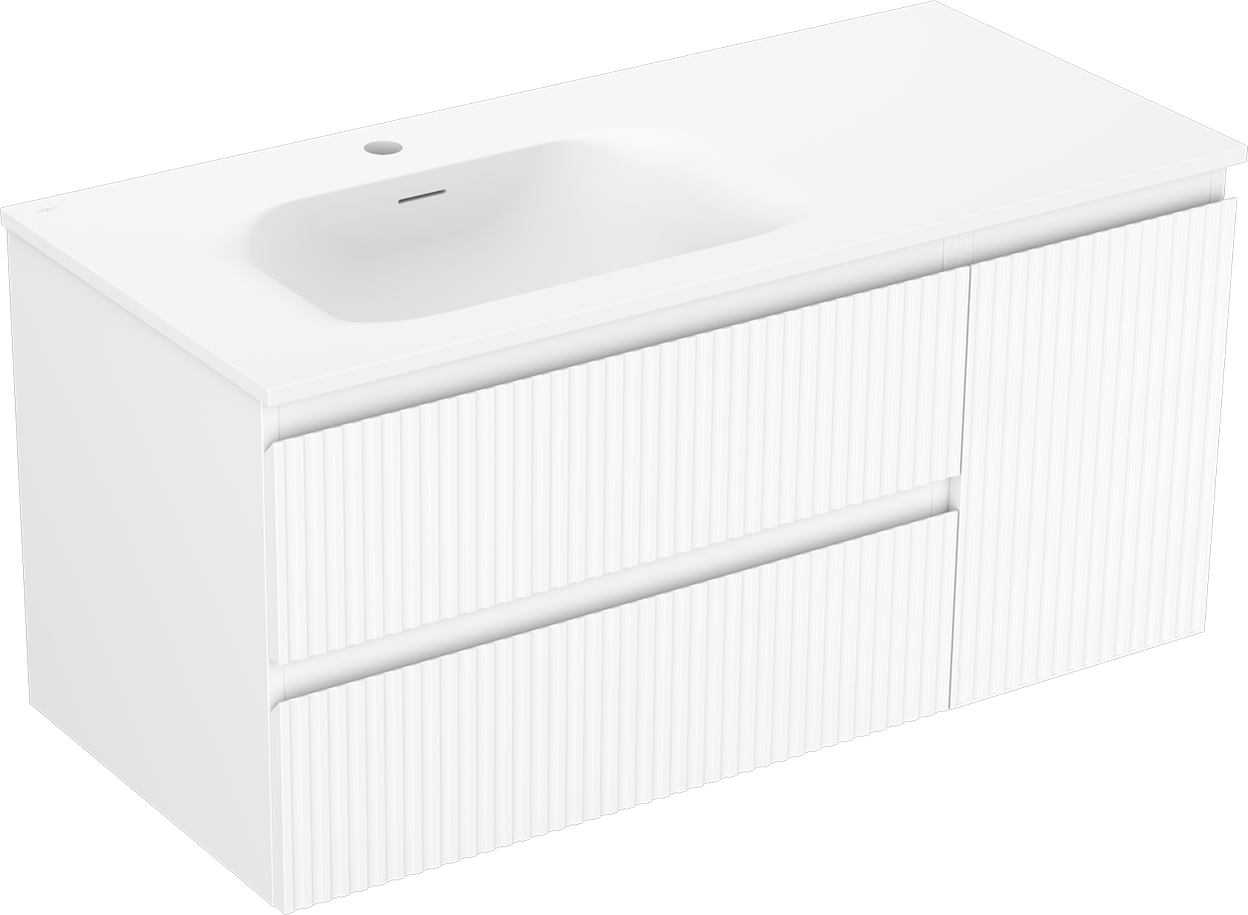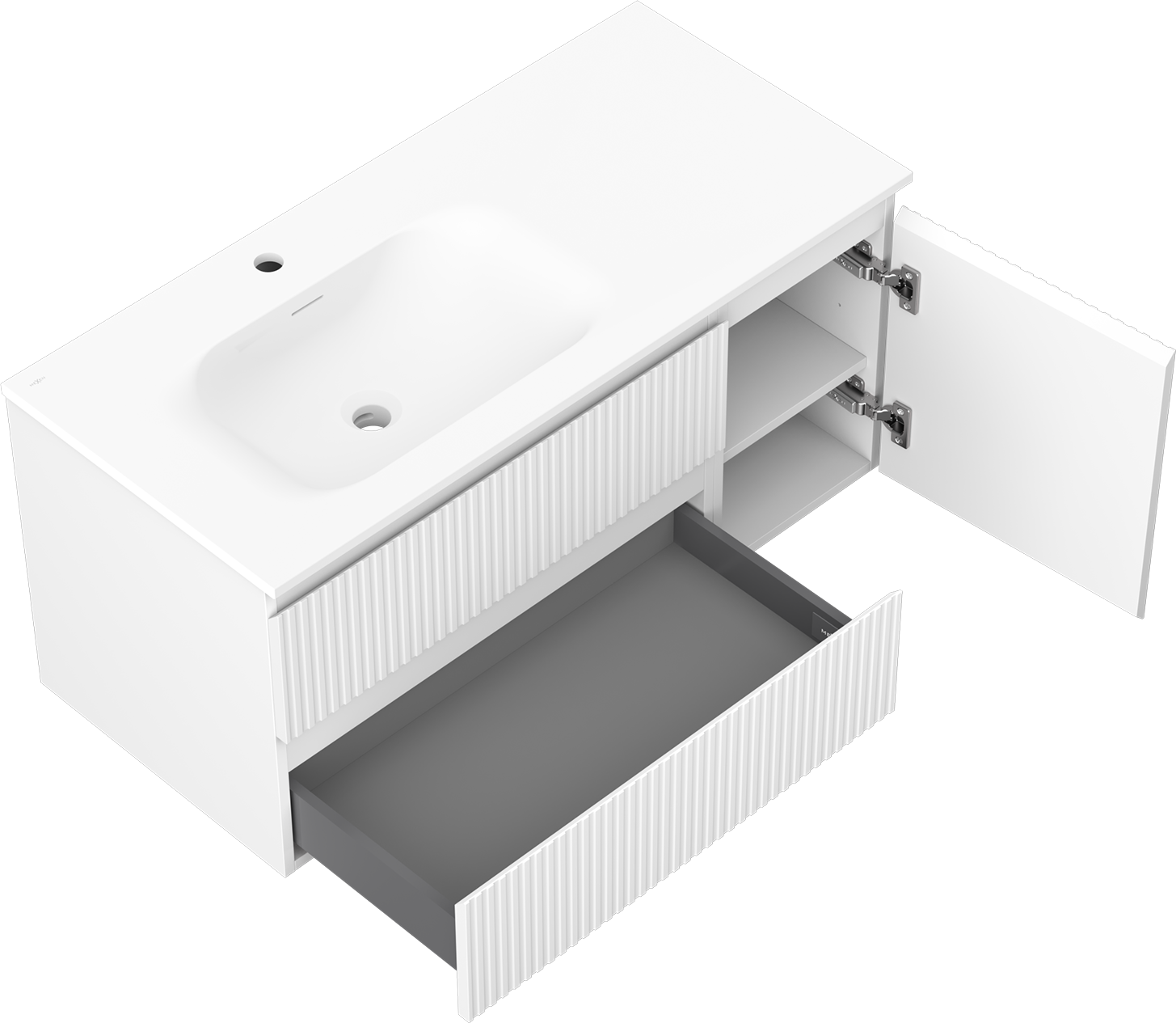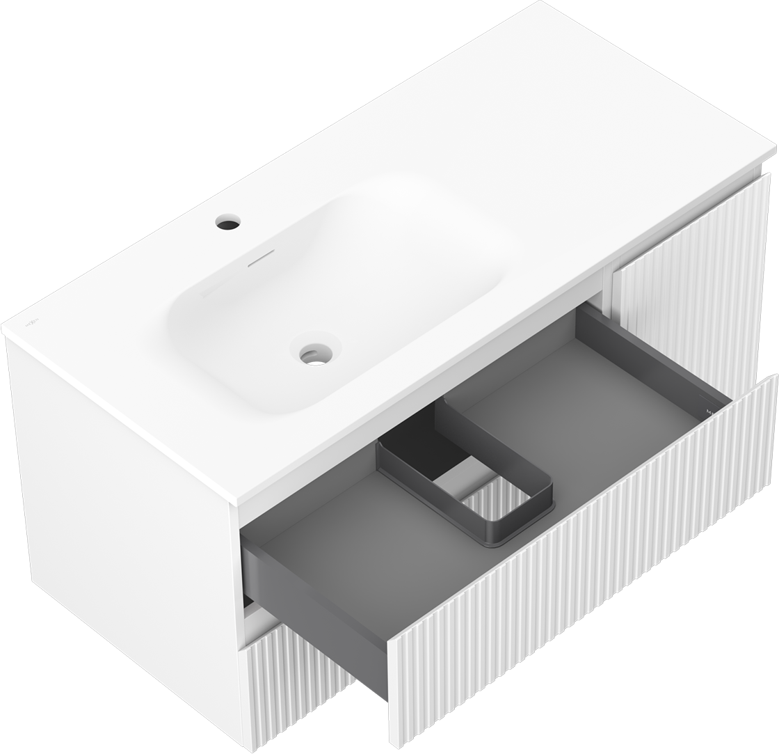 A fiókban lévő kivágás úgy van kialakítva, hogy befogadja a mosdó telepítéseknél szükséges szifont. Ennek köszönhetően a bútor teljesen funkcionálisan felszerelhető anélkül, hogy a fiók terének egy részét fel kellene áldozni a telepítés miatt.