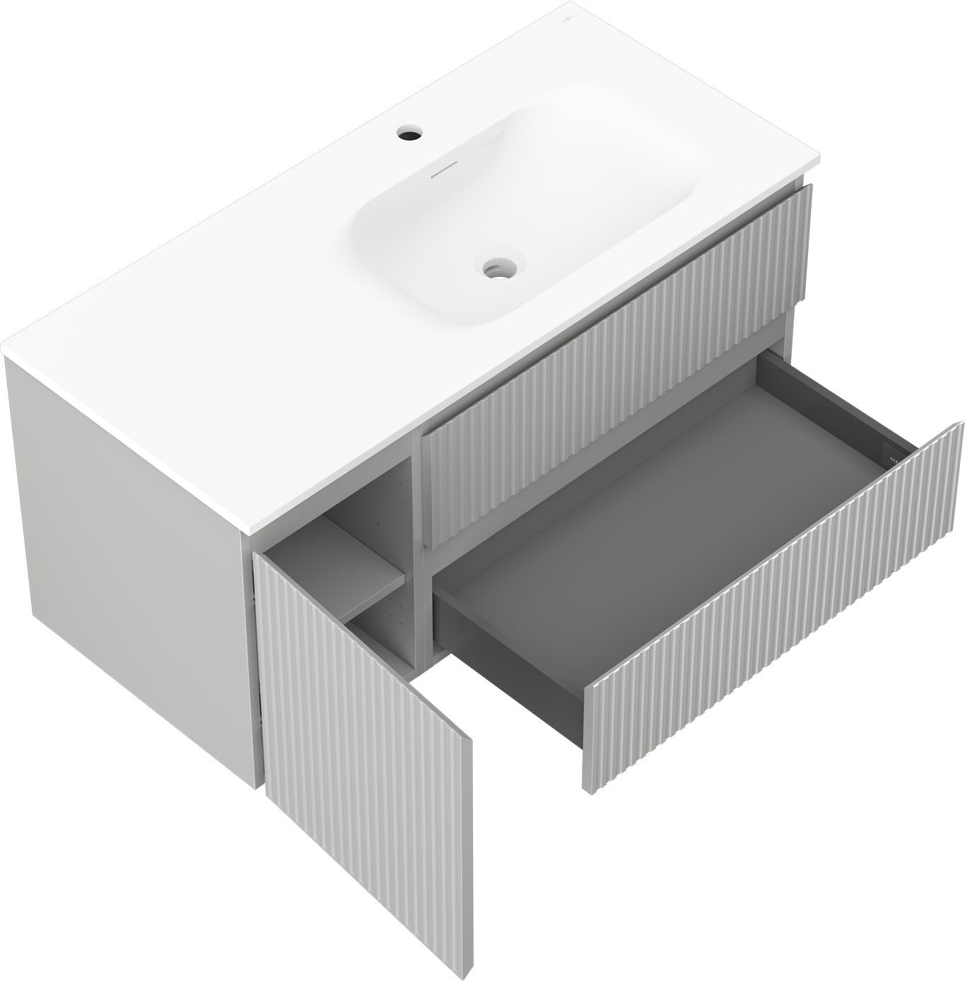 A fiókban lévő kivágás úgy van kialakítva, hogy befogadja a mosdó telepítéseknél szükséges szifont. Ennek köszönhetően a bútor teljesen funkcionálisan felszerelhető anélkül, hogy a fiók terének egy részét fel kellene áldozni a telepítés miatt.