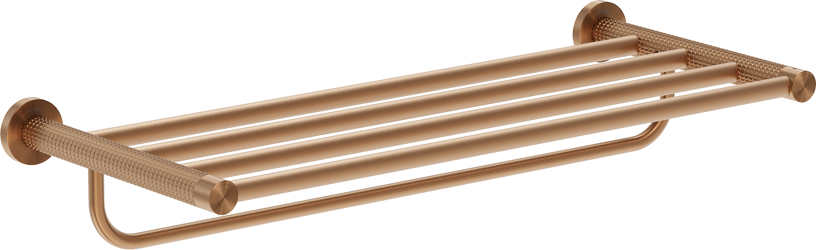 A Mexen Triv törölközőtartó stílusos kiegészítő minden fürdőszobához, amely ötvözi a funkcionalitást az elegáns dizájnnal. Fém anyagból készült és csiszolt rézzel van bevonva, a polc nemcsak gyönyörűen mutat, hanem tartós és ellenáll a sérüléseknek. Szélessége 60 cm, ami kényelmes törölköző tárolást biztosít, és a 10,5 cm-es magasság stabilitást nyújt. A faltól való 25 cm-es távolság optimális elhelyezést tesz lehetővé.