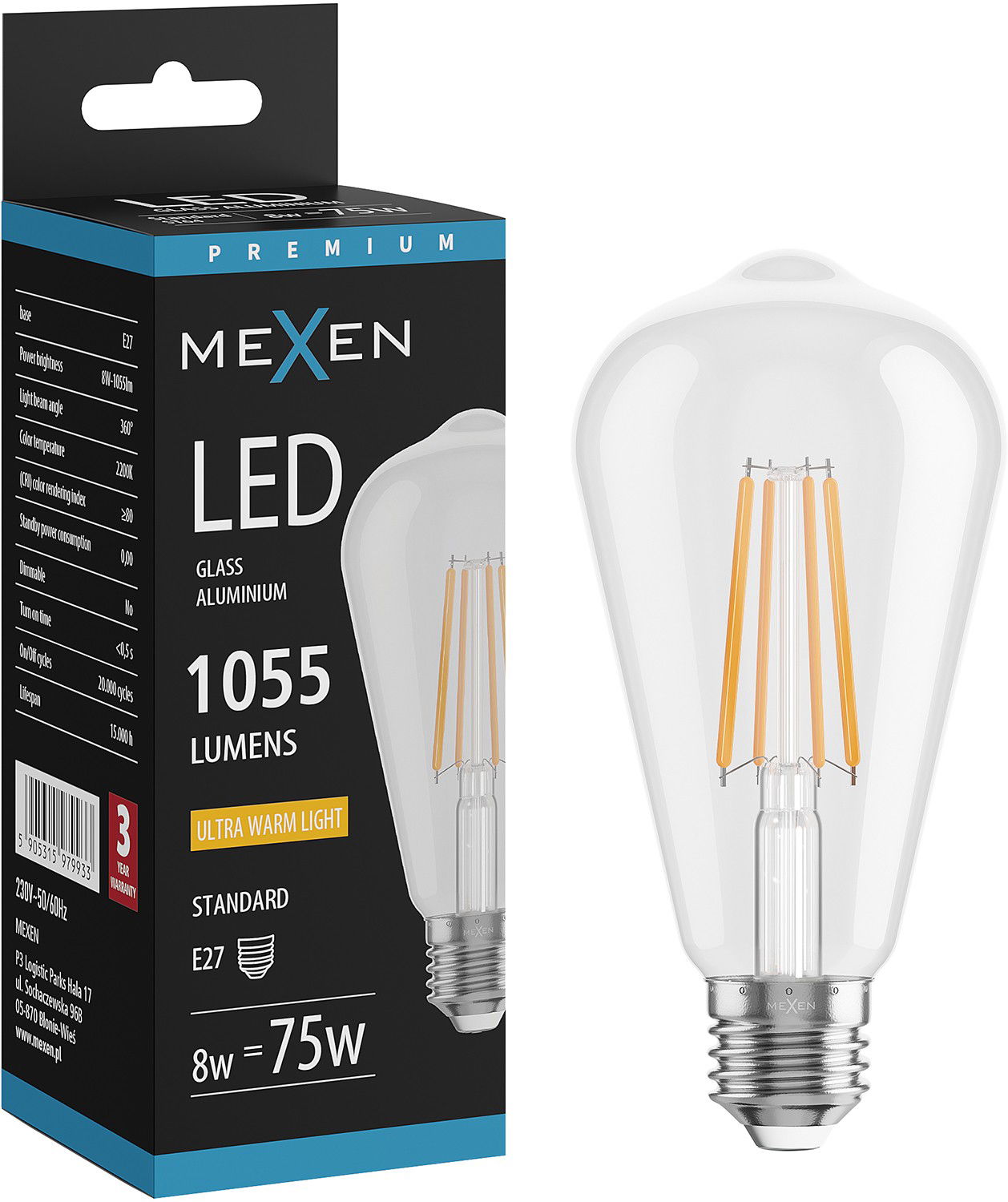 Mexen Vintis LED filament izzó E27, ST64, 8W, Meleg - 2200K, 1055 lm, átlátszó - L152-E27-0822-00