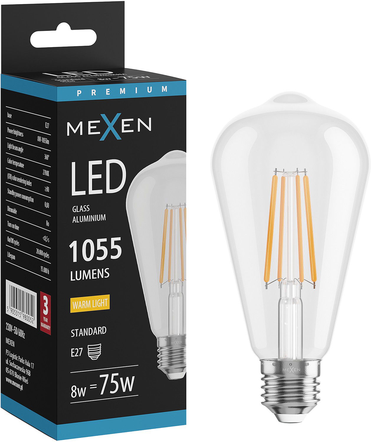 Mexen Vintis LED filament izzó E27, ST64, 8W, Meleg - 2700K, 1055 lm, átlátszó - L152-E27-0827-00