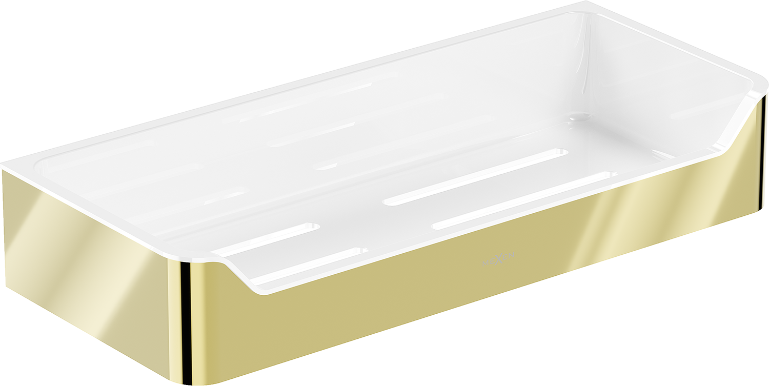 A Mexen Rivon-L fürdőszobai kosár, arany elegáns és funkcionális megoldás a fürdőszobája számára. Tartós AISI 304 rozsdamentes acélból és műanyagból készült, ellenáll a mattulásnak és korróziónak. Az arany színű kivitel eleganciát kölcsönöz, míg a 30,5 cm szélességű és 5,5 cm magasságú polc tökéletesen illeszkedik a modern belső terekhez. A faltól való 13 cm-es távolság és a gyors vízelvezetést biztosító lyukak további előnyei ennek a terméknek.