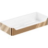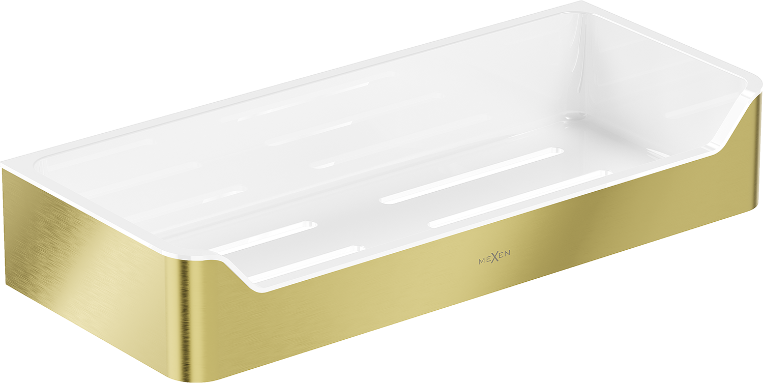 A Mexen Rivon-L fürdőszobai kosár a funkcionalitás és elegancia tökéletes kombinációja a fürdőszobában. Kiváló minőségű AISI 304 rozsdamentes acélból és műanyagból készült, tartósságot és mattulás, valamint korrózió elleni védelmet kínál. Aranyszínű, kefélt felülete kis luxust ad hozzá, szélessége 30,5 cm és magassága 5,5 cm praktikussá és stílusossá teszi. A polcon lévő lyukak biztosítják a víz gyors lefolyását, ami rendet és higiéniát tart fenn. A faltól való távolság 13 cm, ami kisebb helyiségekben is kiváló megoldássá teszi.