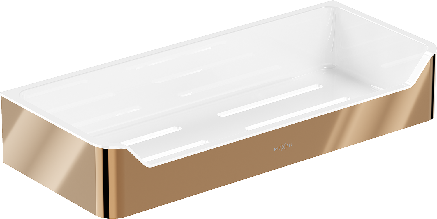 A Mexen Rivon-L fürdőszobai kosár elegáns és funkcionális megoldás minden fürdőszobába. Az AISI 304 rozsdamentes acélból és műanyagból készült termék tartóssággal és ellenálló képességgel rendelkezik a mattulással és a korrózióval szemben. A rózsaarany bevonat luxus jelleget kölcsönöz. A kosár szélessége 30,5 cm, magassága 5,5 cm és a faltól való távolsága 13 cm, így tökéletesen illeszkedik a falra. A lyukakkal ellátott polc gyors vízelvezetést tesz lehetővé, ami növeli a funkcionalitását.