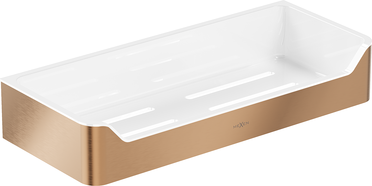 A Mexen Rivon-L fürdőszobai kosár a funkcionalitás és stílus tökéletes kombinációja. Tartós AISI 304 rozsdamentes acélból és műanyagból készült, hosszú távú ellenállást biztosít a mattulással és korrózióval szemben. A kosár elegáns, kefe hatású réz befejezéssel rendelkezik, ami luxus megjelenést kölcsönöz minden fürdőszobának. 30,5 cm szélességével és 5,5 cm magasságával praktikus, lyukai révén pedig gyorsan elvezeti a vizet, rendet tartva. Csak 13 cm-re áll ki a faltól, ami helyet takarít meg.
