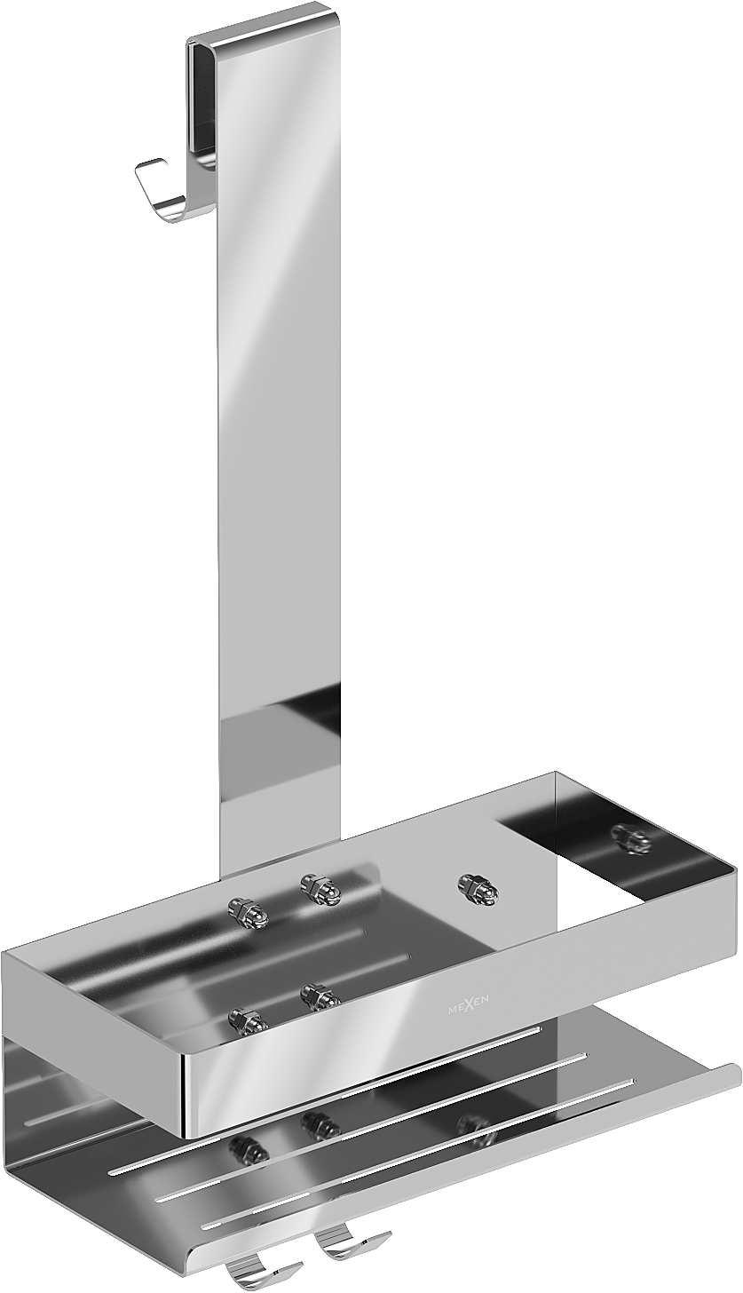 Mexen Brin-1 fürdőszobai kosár akasztóval, króm, ideális megoldás minden fürdőszobába. Kiváló minőségű AISI 304 rozsdamentes acélból készült, ami tartósságot és páralecsapódás- valamint korrózióállóságot biztosít. A krómos bevonat elegáns megjelenést kölcsönöz. A 23 cm széles és 44 cm magas kosár, amelynek falhoz viszonyított távolsága 11,2 cm, 12 mm vastagságú zuhanyüveghez illeszkedik. Egy polccal rendelkezik, amely lyukakkal van ellátva a gyors vízelvezetés érdekében, és a stabilitást tapadókorongok biztosítják. Az oldalakon található további akasztók kényelmesen lehetővé teszik a kellékek és törölközők felakasztását.