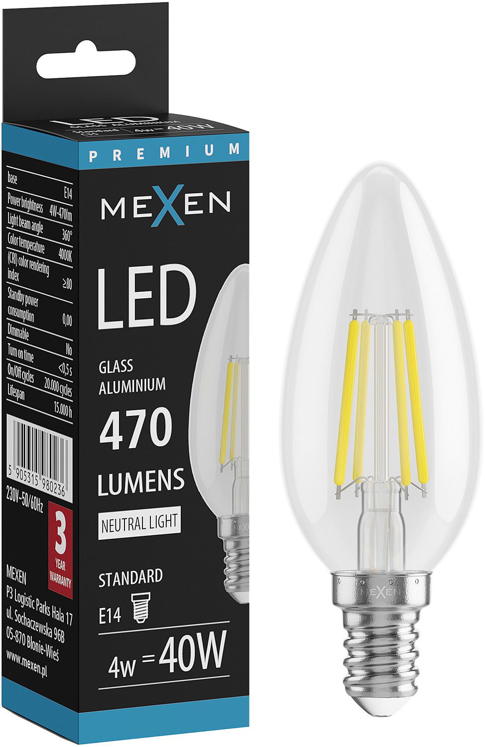 Mexen Vintis LED filament izzó E14, C35, 4W, Semleges - 4000K, 470 lm, átlátszó - L154-E14-0427-00 - L154-E14-0440-00