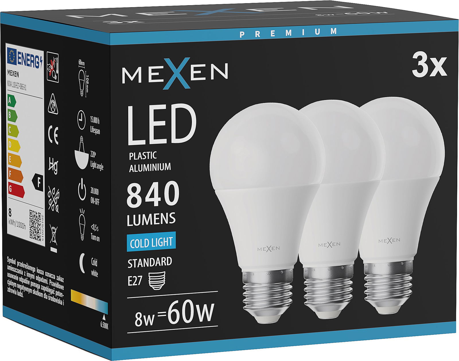 Mexen Nova 3x LED izzó E27, A60, 8W, Hideg - 6500K, 840 lm - L100-E27-0865-01x03