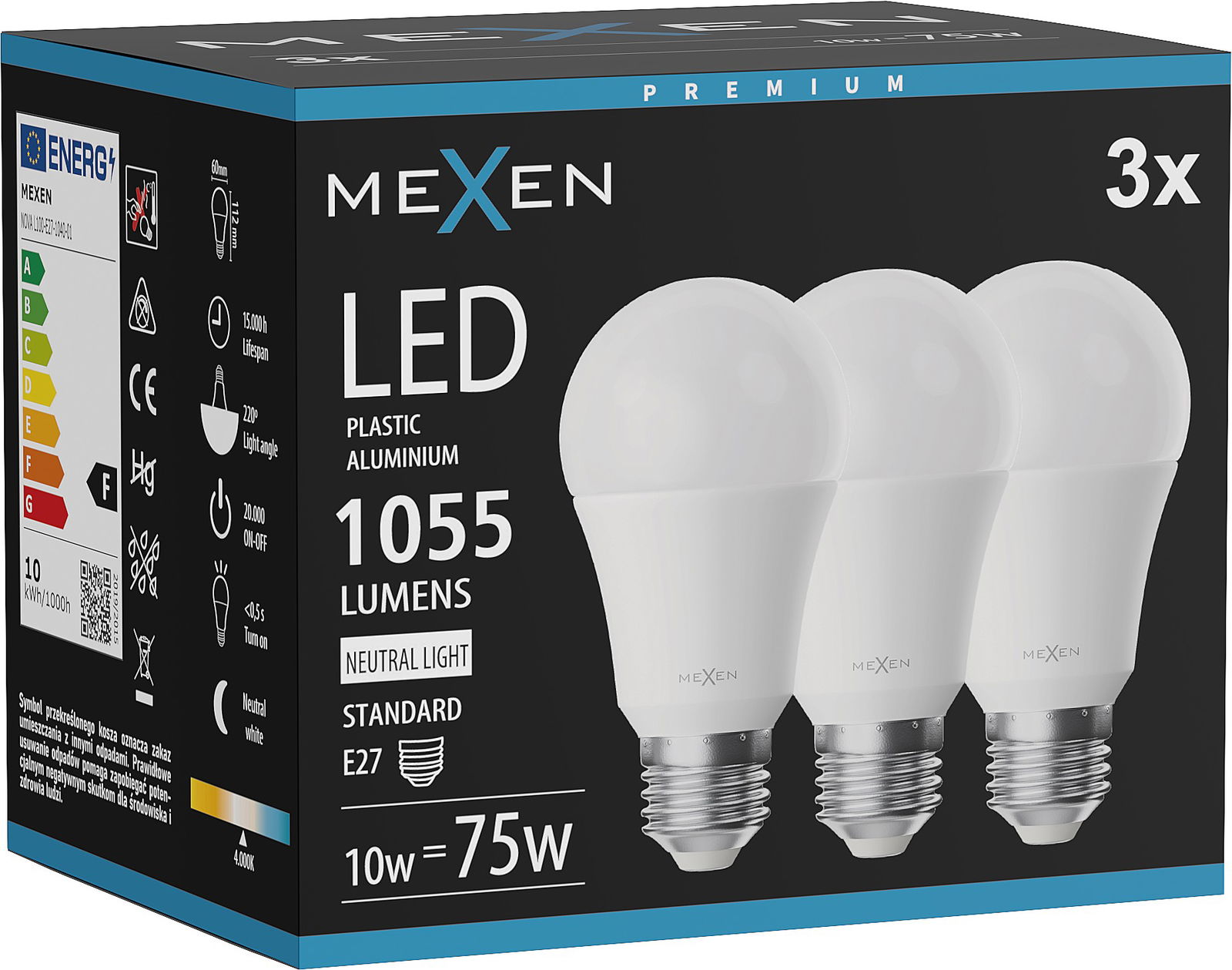 Mexen Nova 3x LED Izzó E27, A60, 10W, Neutrális - 4000K, 1055 lm - L100-E27-1040-01x03