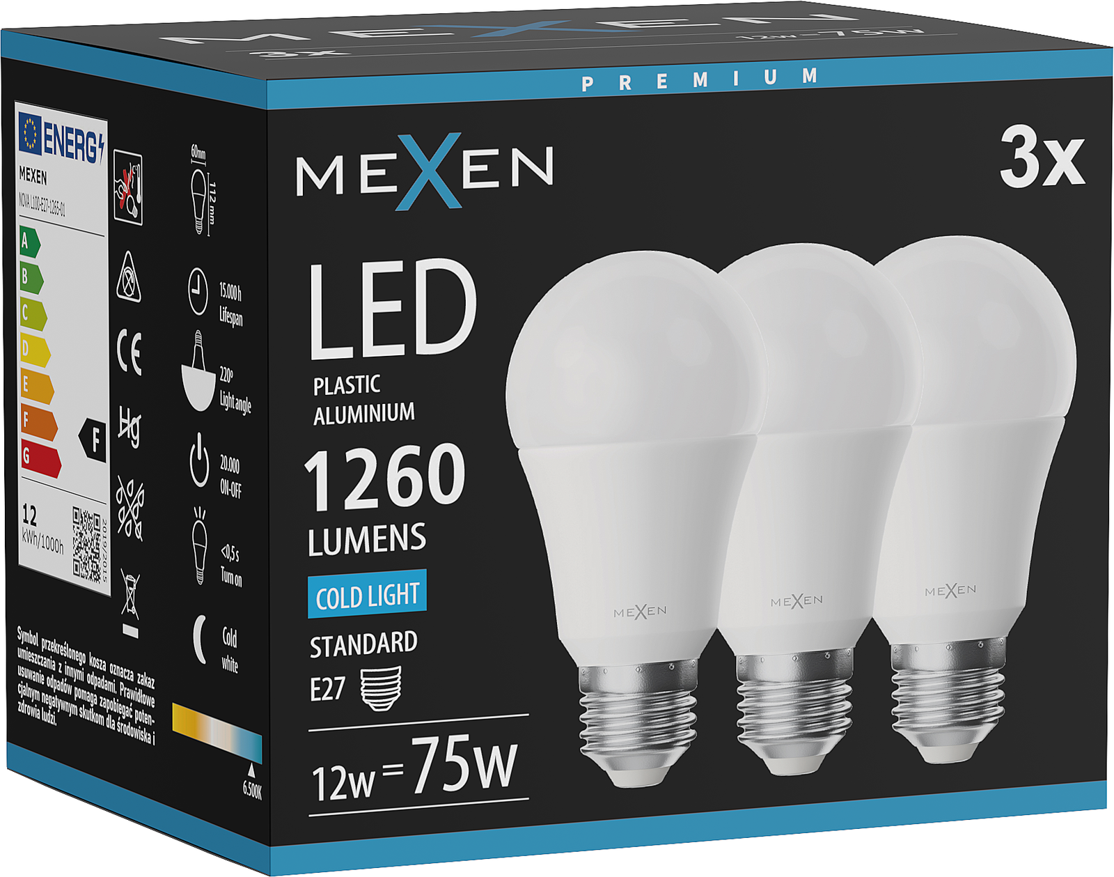 Mexen Nova 3x LED izzó E27, A60, 12W, Hideg - 6500K, 1260 lm - L100-E27-1265-01x03