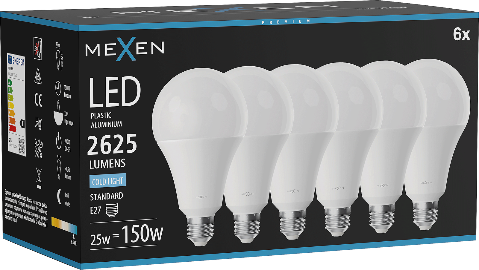 Mexen Nova 6x LED izzó E27, A95, 25W, Hideg - 6500K, 2625 lm - L100-E27-2565-01x06