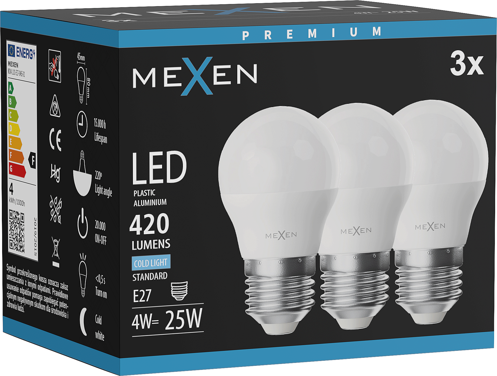 Mexen Nova 3x LED izzó E27, G45, 4W, Hideg - 6500K, 420 lm - L101-E27-0465-01x03