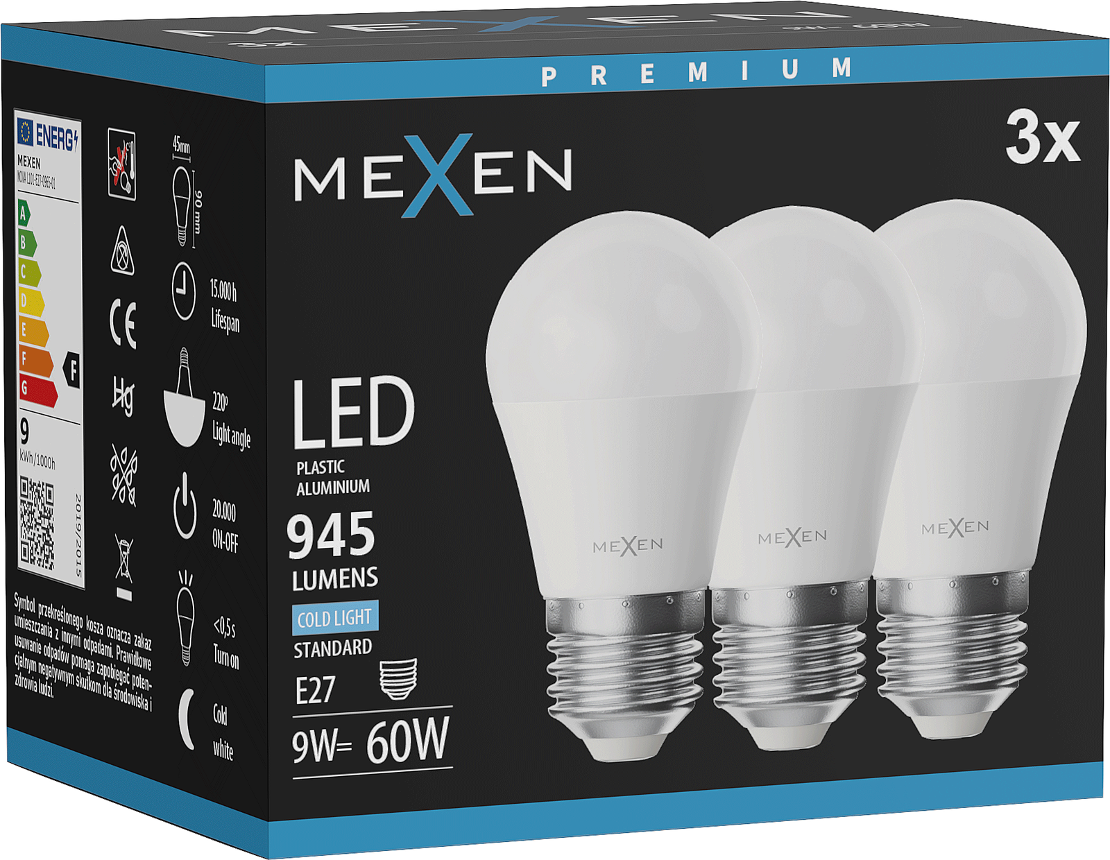 Mexen Nova 3x LED izzó E27, G45, 9W, Hideg - 6500K, 945 lm - L101-E27-0965-01x03