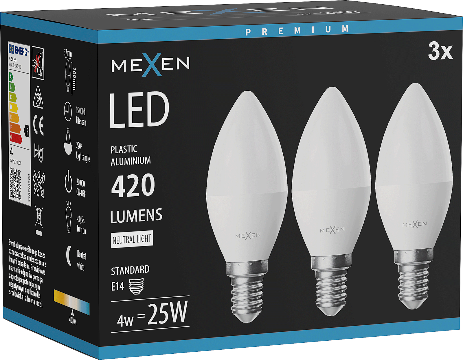 Mexen Nova 3x LED izzó E14, C37, 4W, Semleges - 4000K, 420 lm - L102-E14-0440-01x03