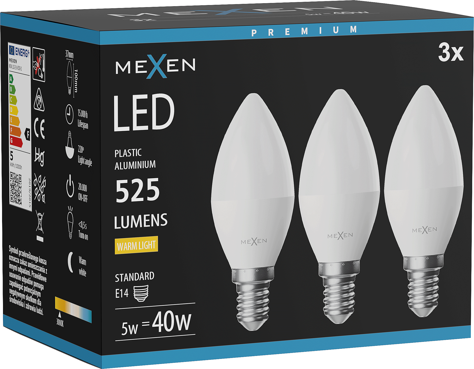 Mexen Nova 3x LED izzó E14, C37, 5W, Meleg - 3000K, 525 lm - L102-E14-0530-01x03