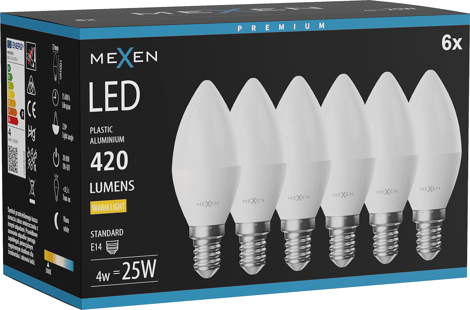 Mexen Nova 6x LED izzó E14, C37, 4W, Meleg - 3000K, 420 lm - L102-E14-0430-01x06