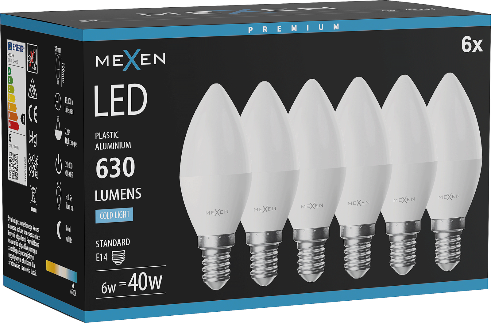 Mexen Nova 6x LED izzó E14, C37, 6W, Hideg - 6500K, 630 lm - L102-E14-0665-01x06