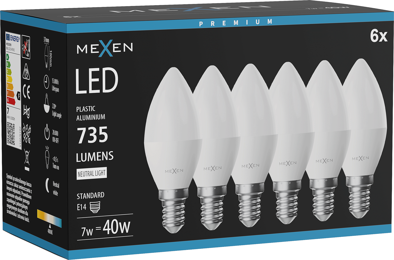 Mexen Nova 6x LED izzó E14, C37, 7W, Semleges - 4000K, 735 lm - L102-E14-0740-01x06