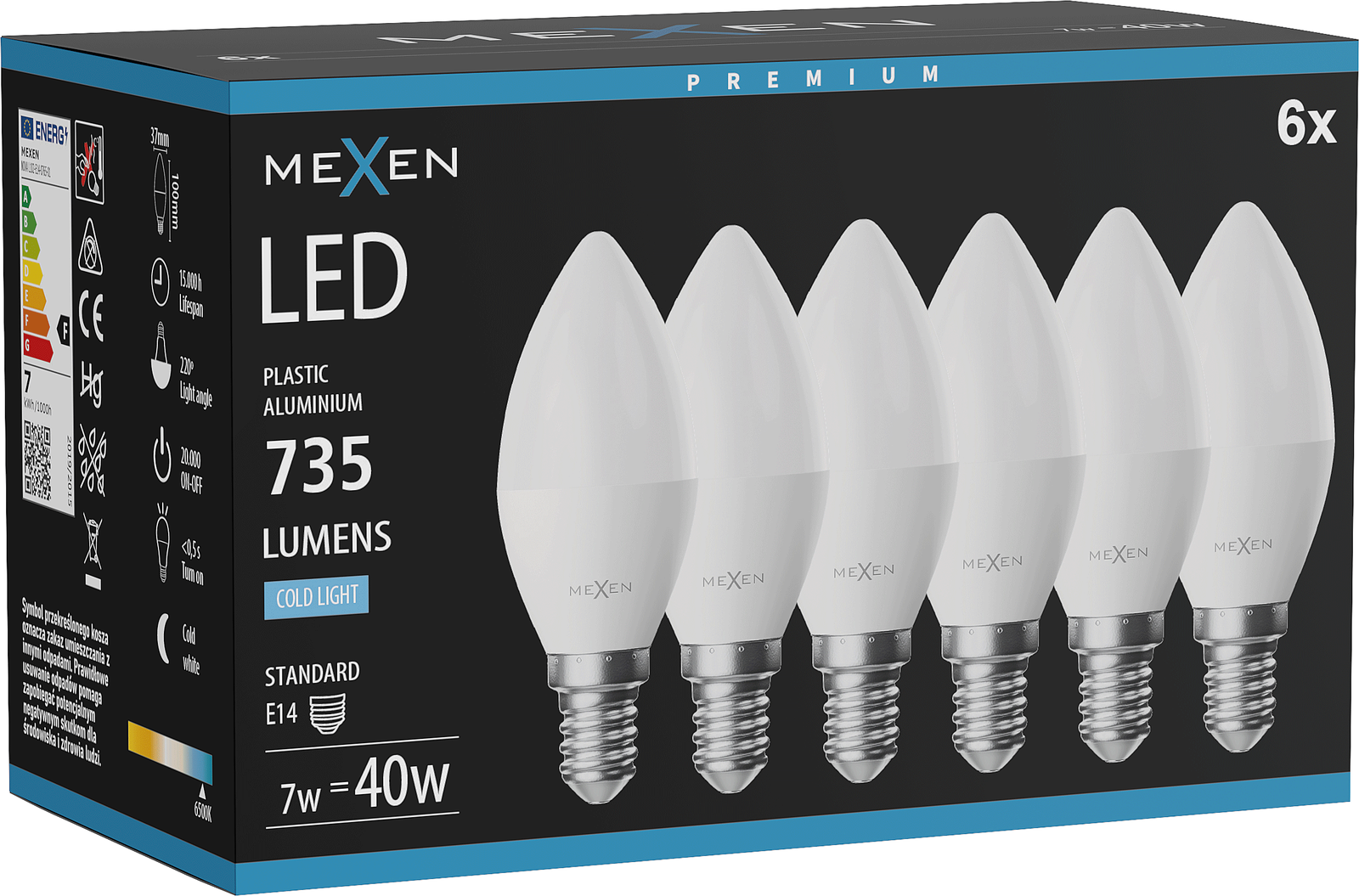 Mexen Nova 6x LED izzó E14, C37, 7W, Hideg - 6500K, 735 lm - L102-E14-0765-01x06