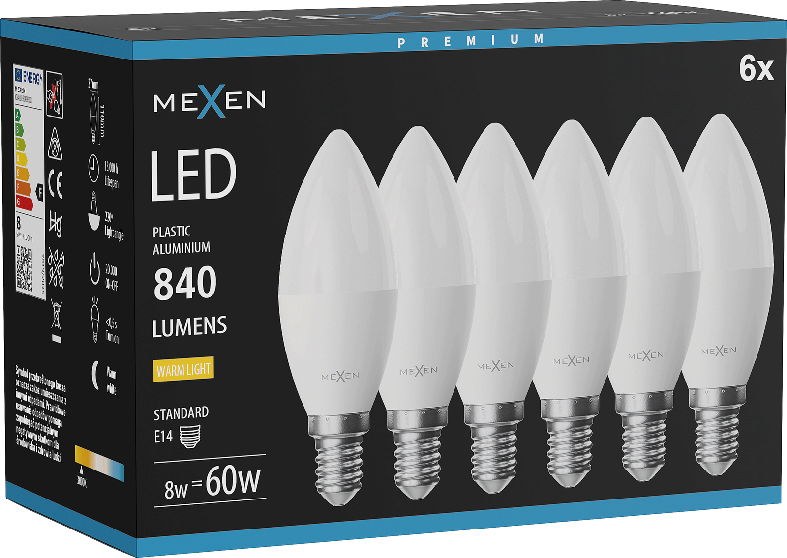 Mexen Nova 6x LED izzó E14, C37, 8W, Meleg - 3000K, 840 lm - L102-E14-0830-01x06