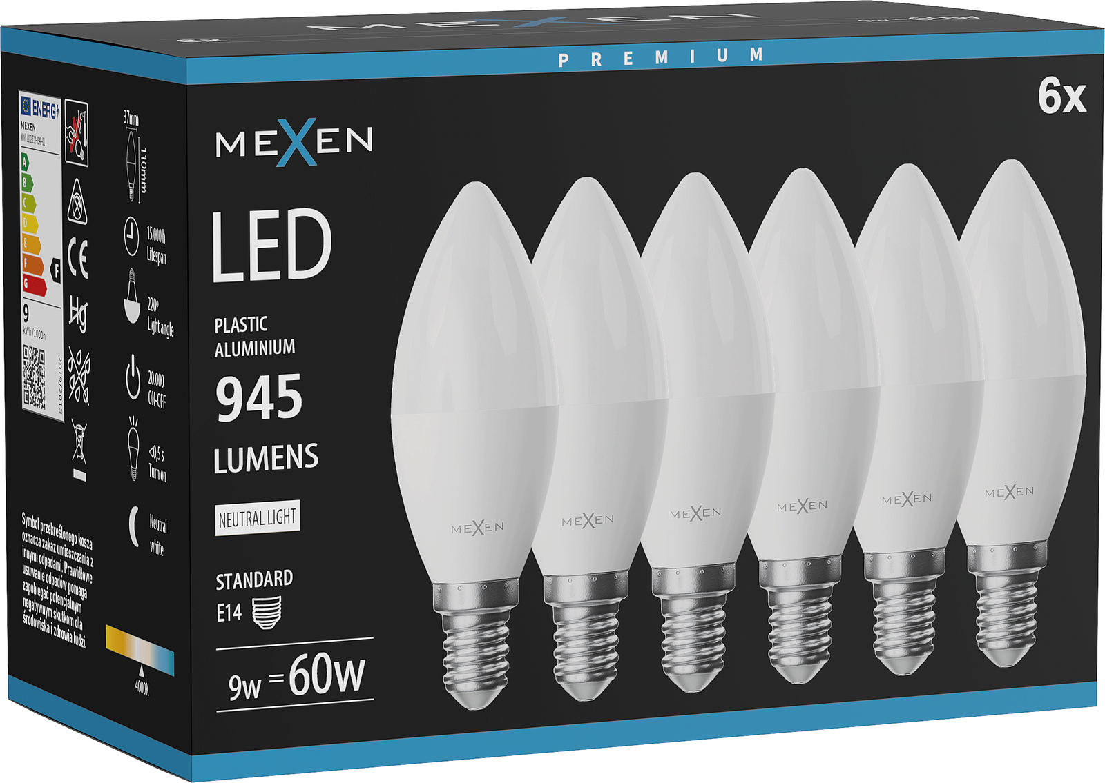 Mexen Nova 6x LED izzó E14, C37, 9W, Semleges - 4000K, 945 lm - L102-E14-0940-01x06