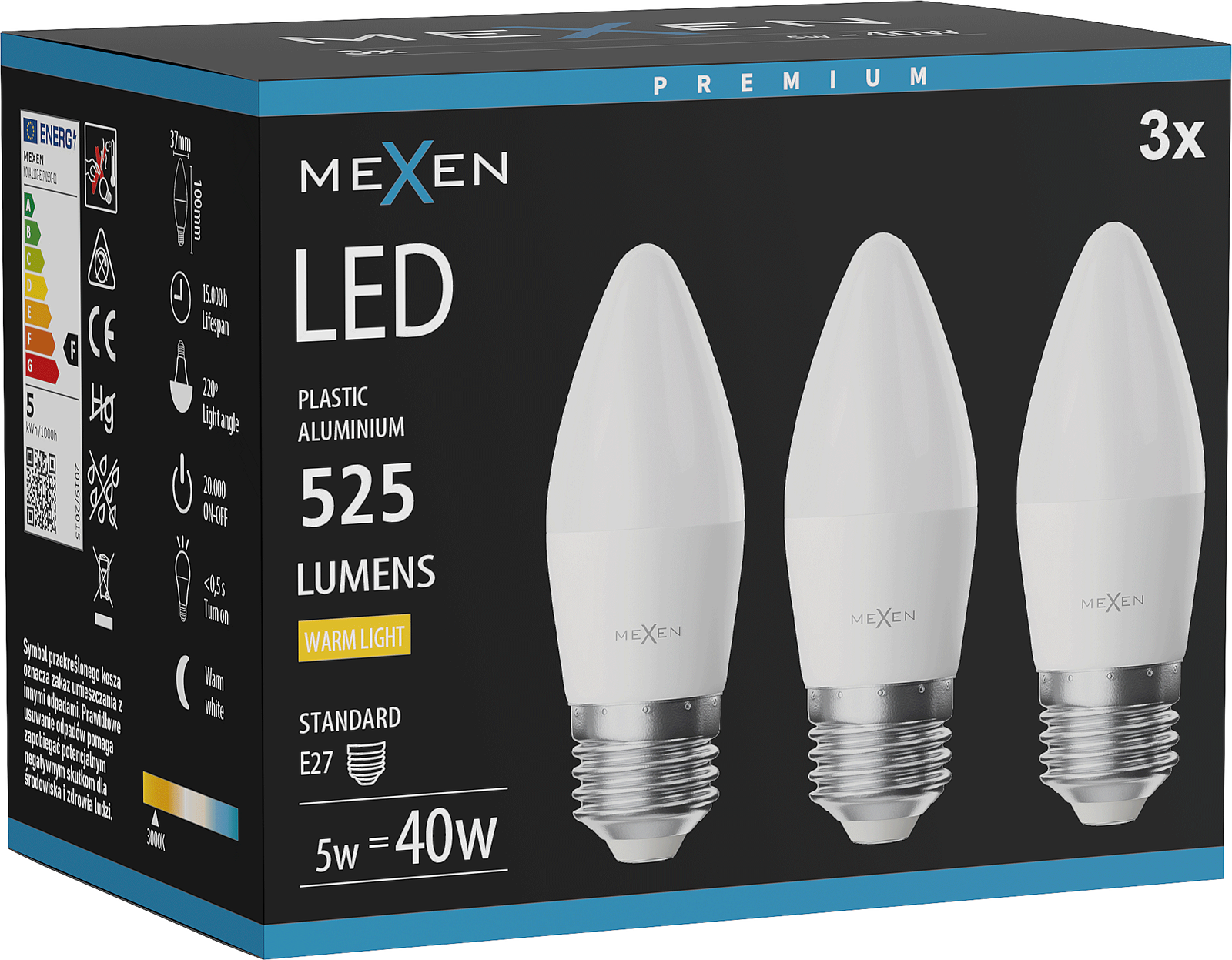Mexen Nova 3x LED izzó E27, C37, 5W, Meleg - 3000K, 525 lm - L102-E27-0530-01x03