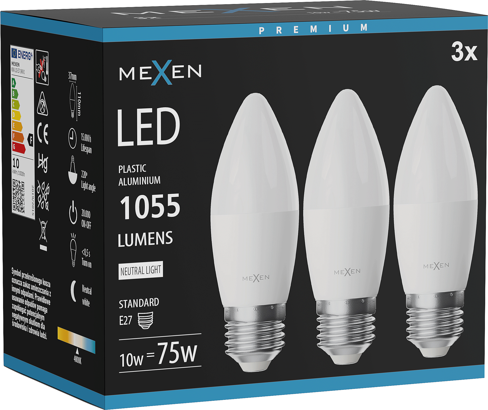 Mexen Nova 3x LED izzó E27, C37, 10W, Semleges - 4000K, 1055 lm - L102-E27-1040-01x03