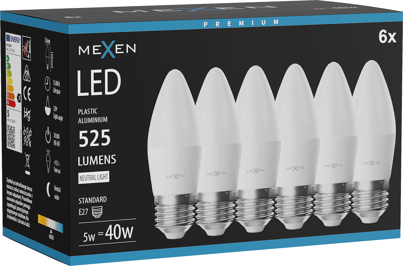 Mexen Nova 6x LED izzó E27, C37, 5W, Semleges - 4000K, 525 lm - L102-E27-0540-01x06