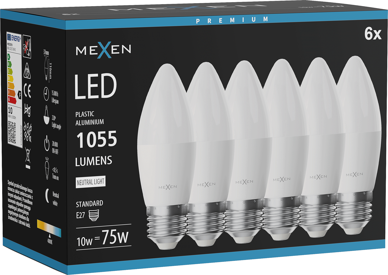 Mexen Nova 6x LED izzó E27, C37, 10W, Semleges - 4000K, 1055 lm - L102-E27-1040-01x06