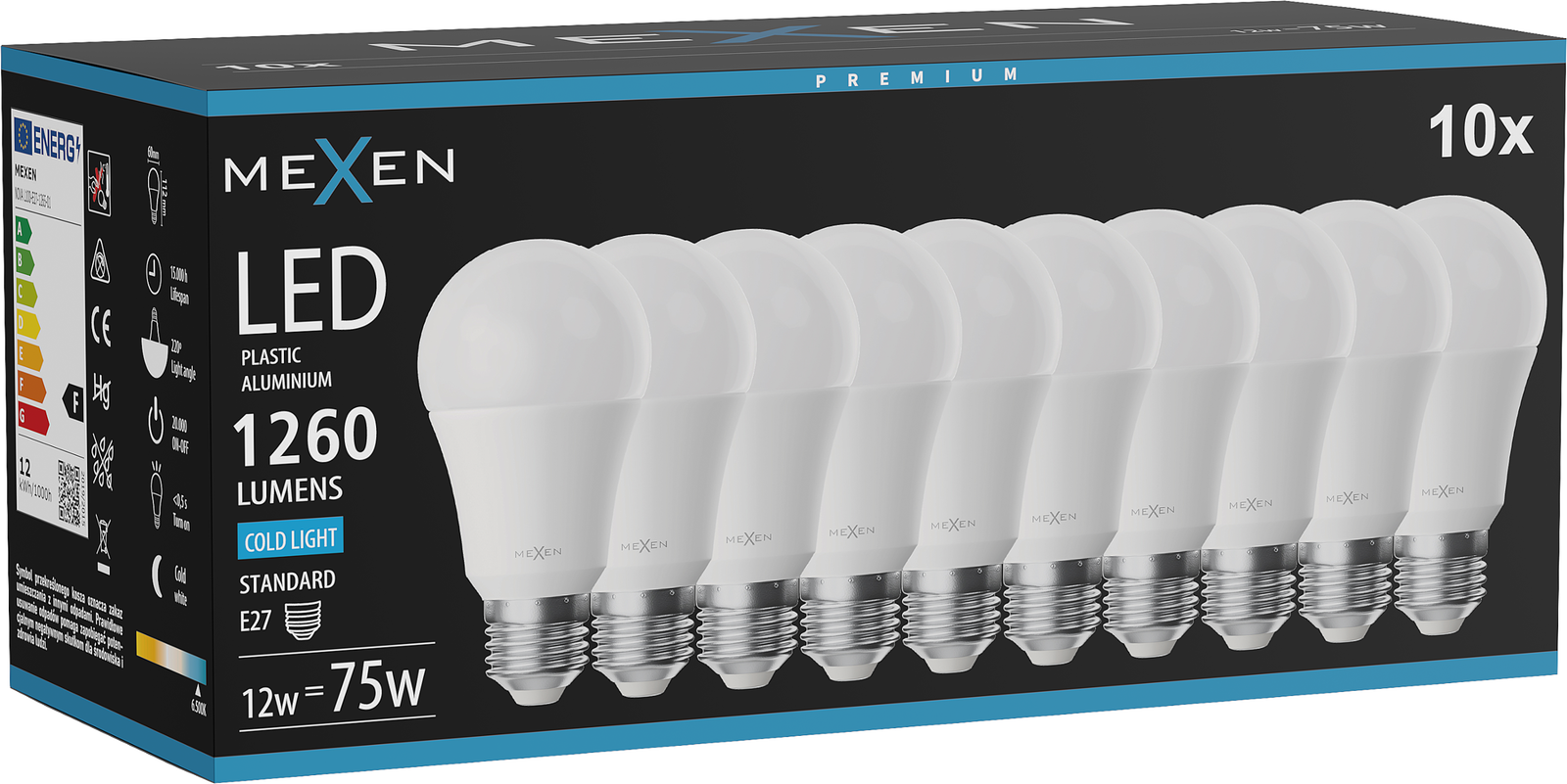 Mexen Nova 10x LED izzó E27, A60, 12W, Hideg - 6500K, 1260 lm - L100-E27-1265-01x10