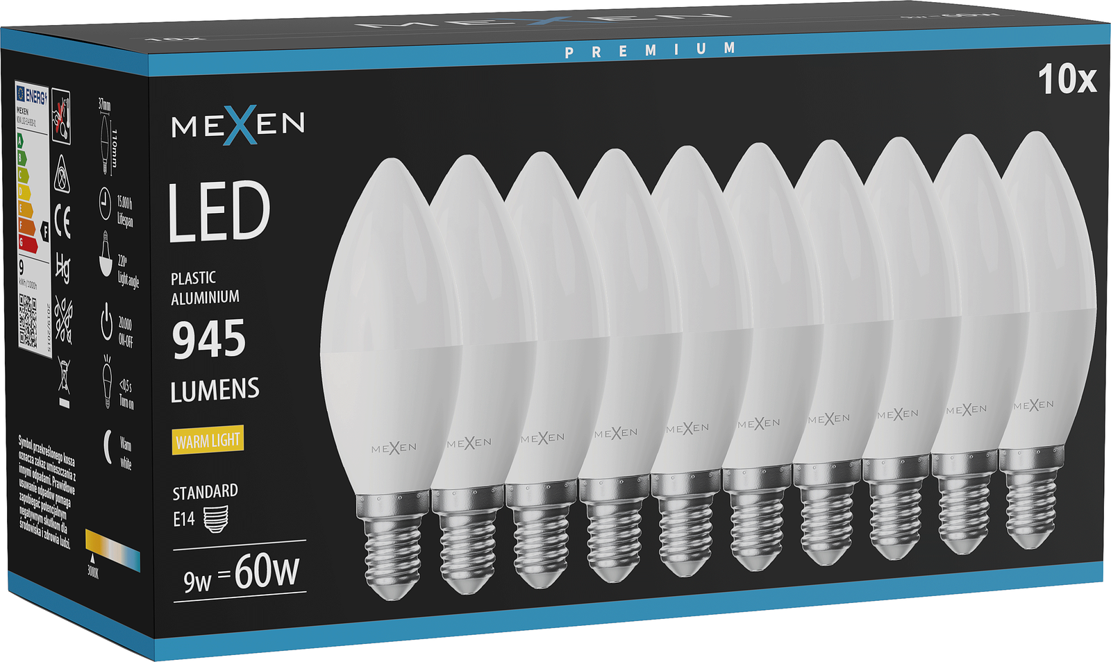 Mexen Nova 10x LED izzó E14, C37, 9W, Meleg - 3000K, 945 lm - L102-E14-0930-01x10