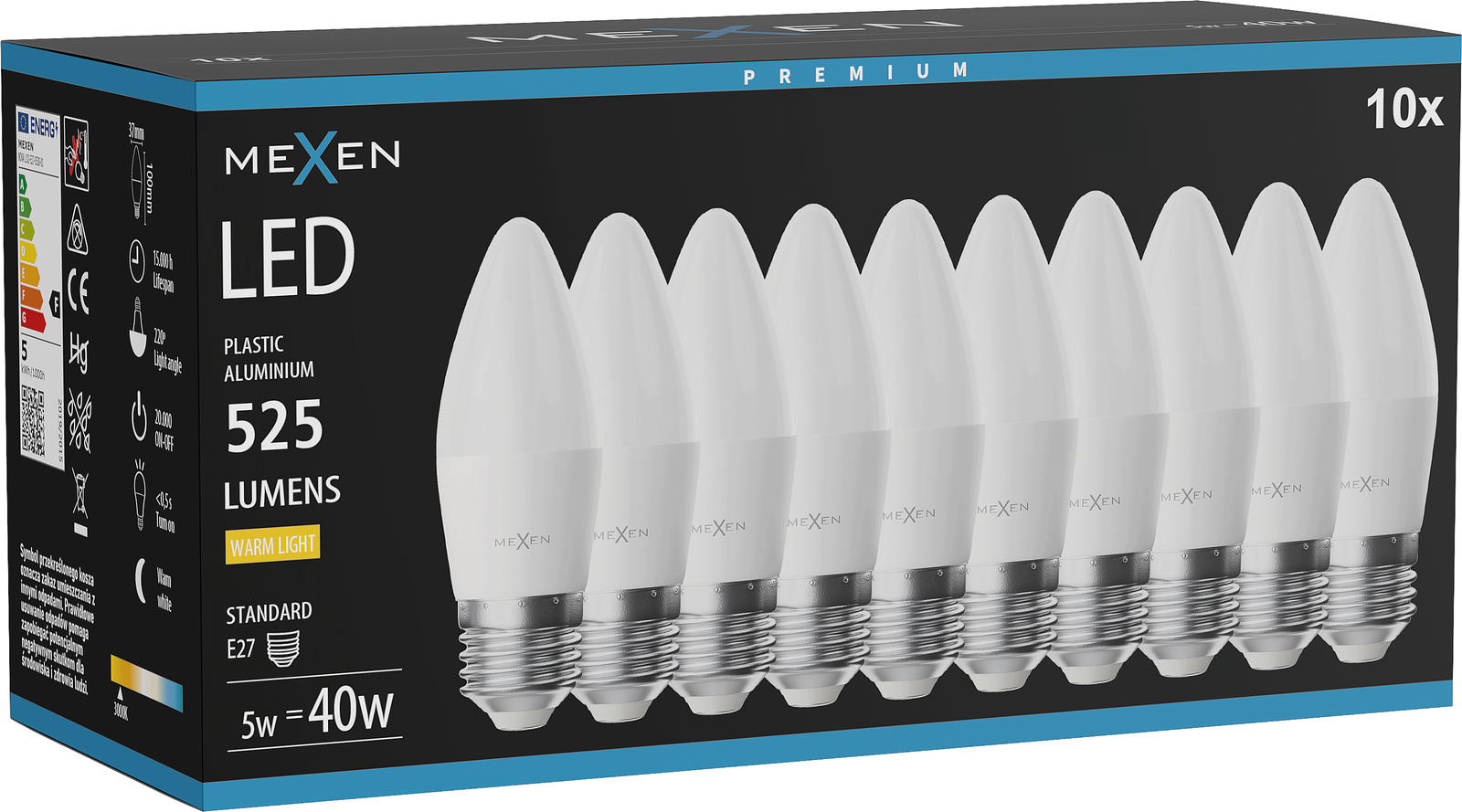 Mexen Nova 10x LED Izzó E27, C37, 5W, Meleg - 3000K, 525 lm - L102-E27-0530-01x10