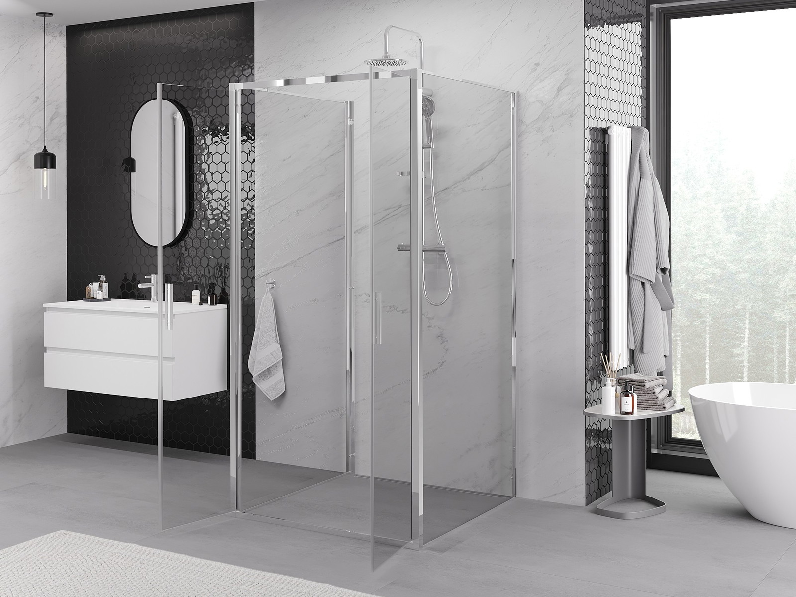 Mexen Exo-3S háromfalas zuhanykabin nyílóajtóval, 70 x 70 cm, átlátszó, króm - 814-070-070-01-00-3S